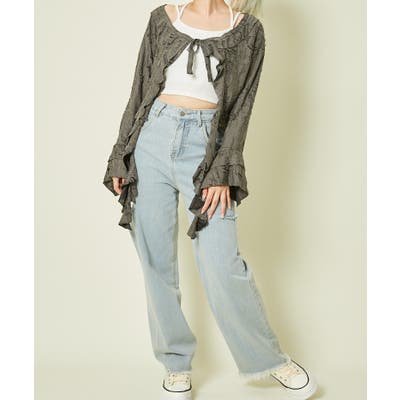 全体に入ったダメージディテールが、こなれ感と抜け感を演出。フロントはリボンで軽く結ぶ仕様になっており、開けて羽織っても、リボンを結んでも可愛い◎袖口や裾にかけて広がるフリル使いがフェミニンなムードを添えつつ、程よくラフに着られるバランス感が魅力です。