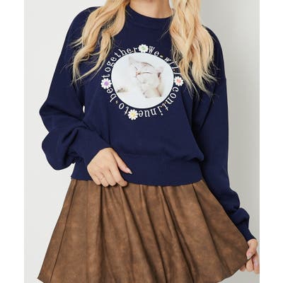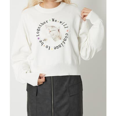 フロントにネコのフォトプリントをあしらった、遊び心あふれるニットトップス。