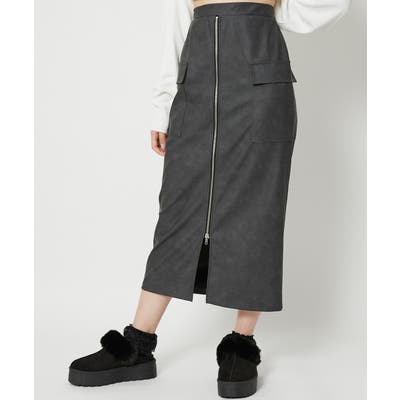 フェイクレザー素材にフロントジップを効かせた、モード感たっぷりのナロースカート。