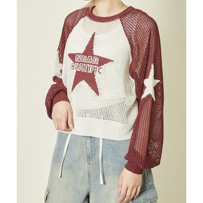 《メッシュ×ビッグスター》レディース ニットプルオーバー 透かし編み 春夏秋