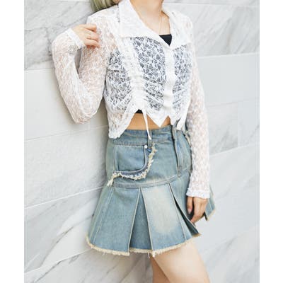 レースの透け感とディテールが目を惹く、エリつきレースドロストトップス。