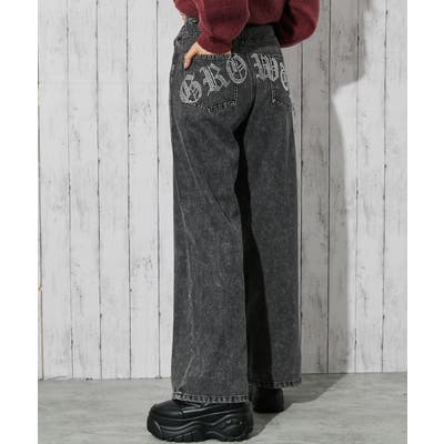 《バックロゴ×ラインストーン》レディース デニムパンツ ワイドシルエット
