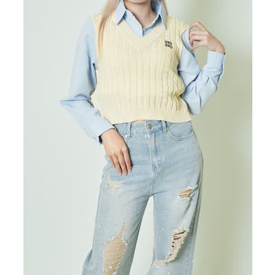 ケーブル編みのニットベストと、ハリ感のあるシャツ生地をドッキング。Vネックの抜け感とクロップド丈のバランスが絶妙で、ウエスト位置が高く見える視覚効果も◎フロントのワンポイント刺繍が、さりげないアクセントに。