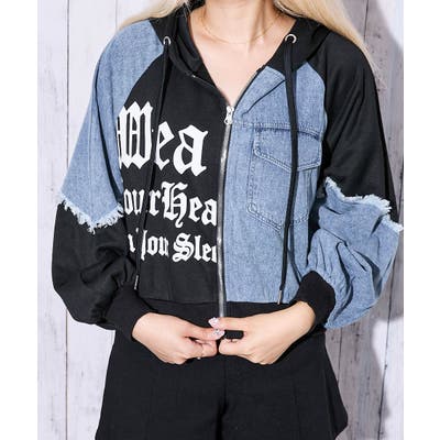 《短丈デニム切替×ロゴ》レディース 裏毛ジップパーカー クロップド丈