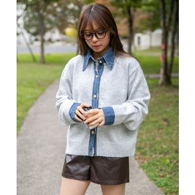 《デニム衿×フェイクレイヤード》レディース ニットトップス ミドル丈 秋冬