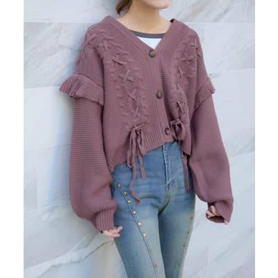 フロントのレースアップデザインと袖のフリルがアクセントになったショート丈ニットカーデ。フェミニンさの中に程よいカジュアル感をプラスした、今季らしいデザインです。