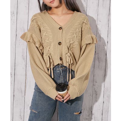 《レースアップ×袖フリル》レディース ニットカーディガン ショート丈 秋冬
