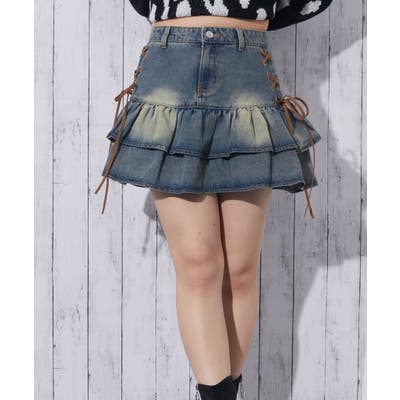 《サイドスエードリボン×ティアード切替》レディース デニム ミニスカート