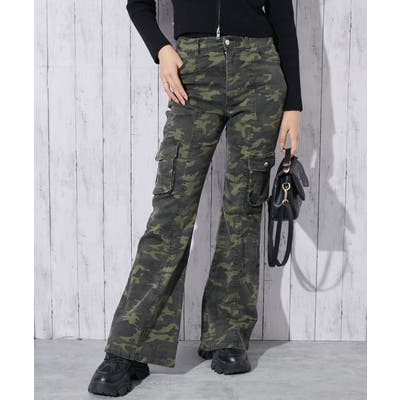 《カモフラ×カーゴ》レディース ストレッチフレアパンツ ミリタリー柄 秋冬春