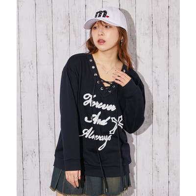 《編み上げデザインでアクセント プリント入り裏毛トレーナー》