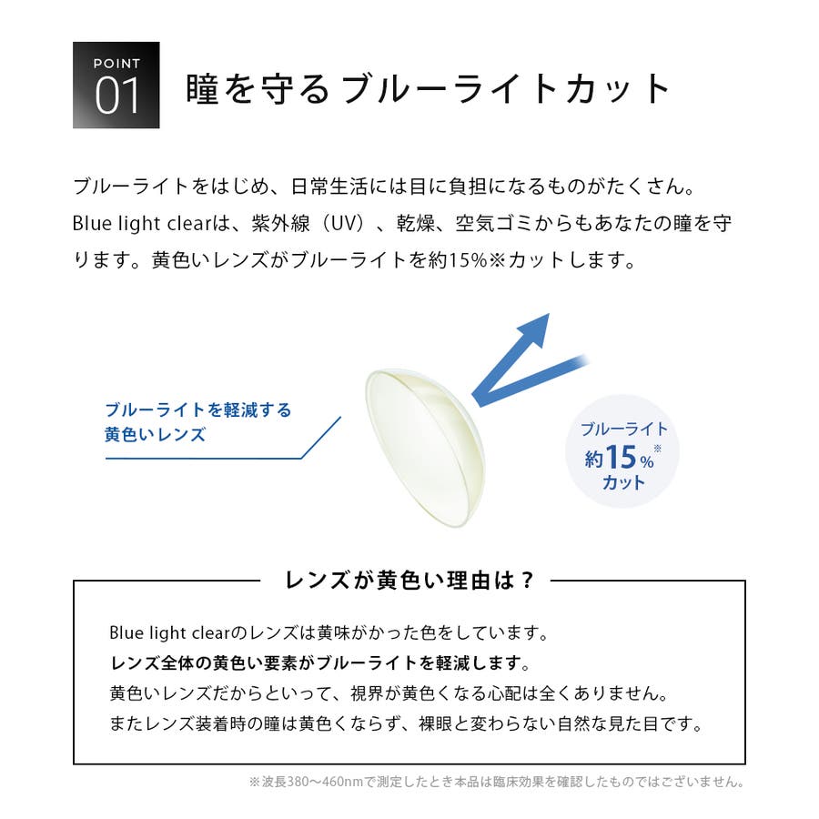レンズはやや薄黄色。ブルーライトカットだから?装着感は良し。丸一日装着していても乾いたり疲れたりすることがほぼなし。何よりPC業務を長時間行った時の疲労感が、他のレンズ装着時と全く違います。