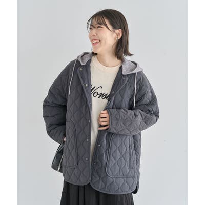 キルティング ブルゾン 2WAY フード取り外し可能 ノーカラー サイドスリット ライトアウター 着回し 秋 冬 レディース