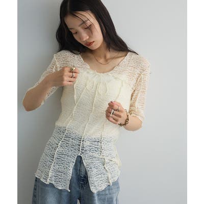 表情豊かなカットワークレースにメローを施したキュートな半袖トップス。ソフトフィットなシルエットに五分袖がトレンドのバレエコアスタイルにも最適なデザインです。フロントのリボンが女性らしい華やかさを演出。一枚加えるだけで旬なレイヤードのスタイリングが決まるおすすめのアイテムです。