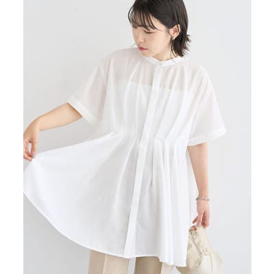 #Aライン#バンドカラーシャツ#チュニック丈#体型カバー#透け感#半袖#ヒップカバー#シャツワンピ風#夏#フレアシルエット#オフィス#レディース