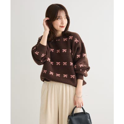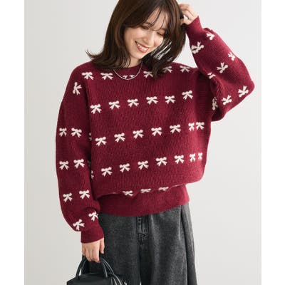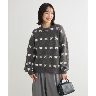 トレンドのリボンモチーフがお洒落なジャガードニットプルオーバー。フェミニンな雰囲気ながら肩の落ちたリラックスシルエットが程よくカジュアルさを加え、一枚でサマ見えするデザインが魅力です。インナーにシャツを合わせたレイヤードスタイルもおすすめ。シンプルなボトムに合わせるだけで華やかなコーディネートが完成するおすすめのアイテムです。透け感[なし]