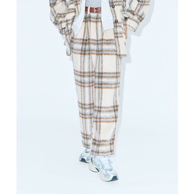 大柄チェックと光沢シャギーがトレンドライクな WITH KURUMI.N デザインパンツ。裾に向かってボリュームを抑えた旬のコクーンシルエットがおしゃれなポイントです。バックウエストゴム仕様で楽に着脱出来、アレンジが楽しめるベルトホール付き。レッグラインを拾わずリラクシーな穿き心地ながら、トラディショナルに決めてくれる今季おすすめのアイテムです。透け感[なし]