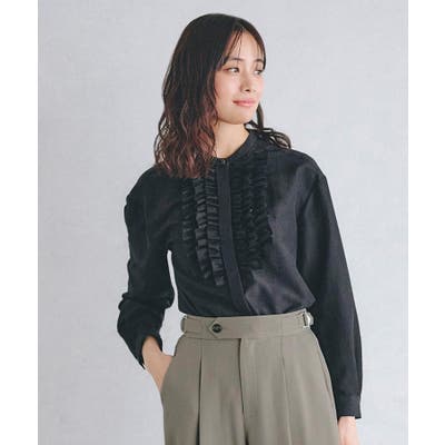 フロントのフリルが存在感あり何に合わせても華やかにきまるブラウスです。