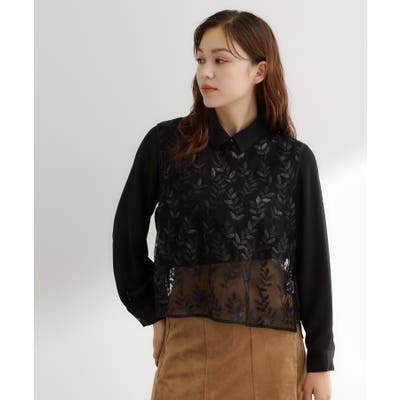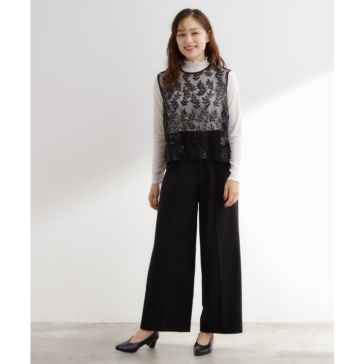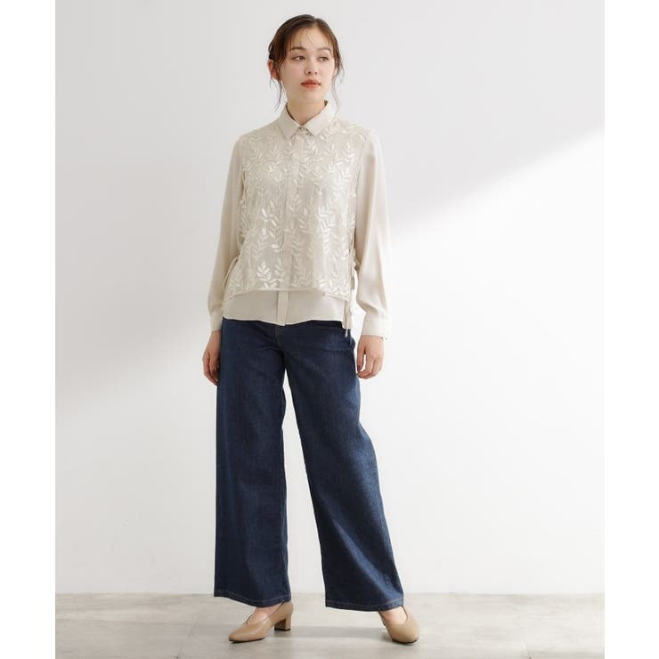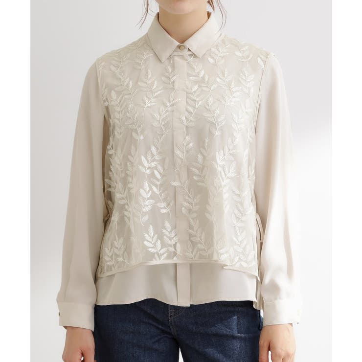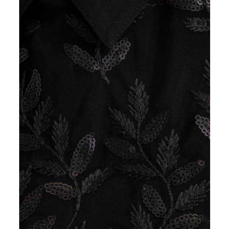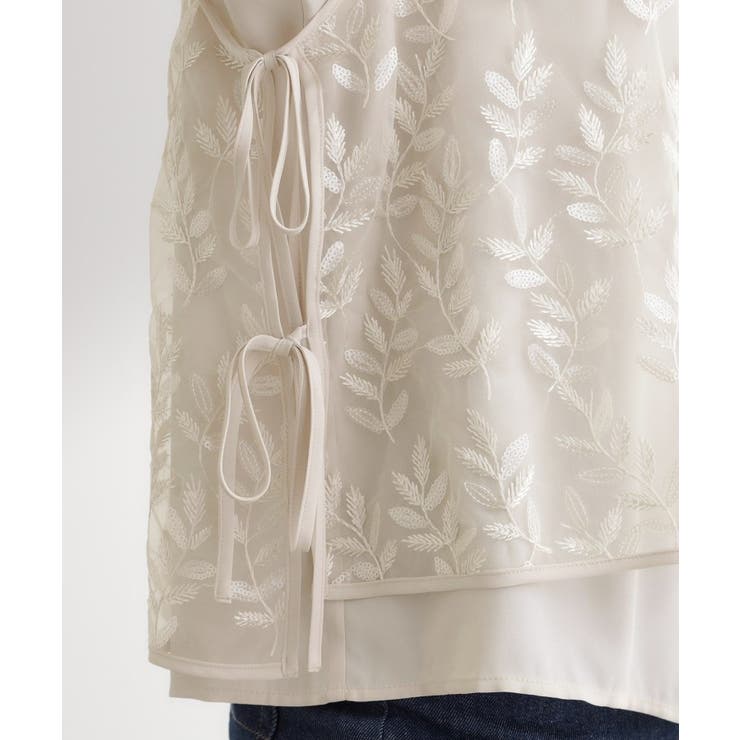 リーフ柄の刺繍にスパンコールを散りばめたベストと、とろみ素材のシャツブラウスをレイヤードしたセットアイテムです。