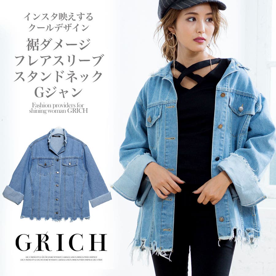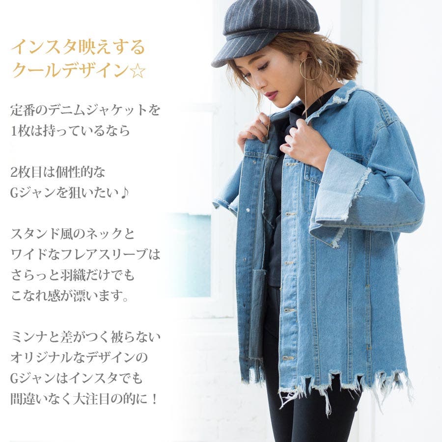 デニムジャケットを1枚は持っているなら 2枚目は個性的なGジャンを狙いたい♪ スタンド風のネックとワイドなフレアスリーブはさらっと羽織だけでもこなれ感が漂います。 ミンナと差がつく被らないオリジナルなデザインのGジャンはインスタでも間違いなく大注目の的に!!