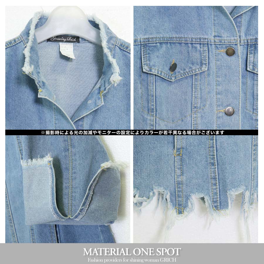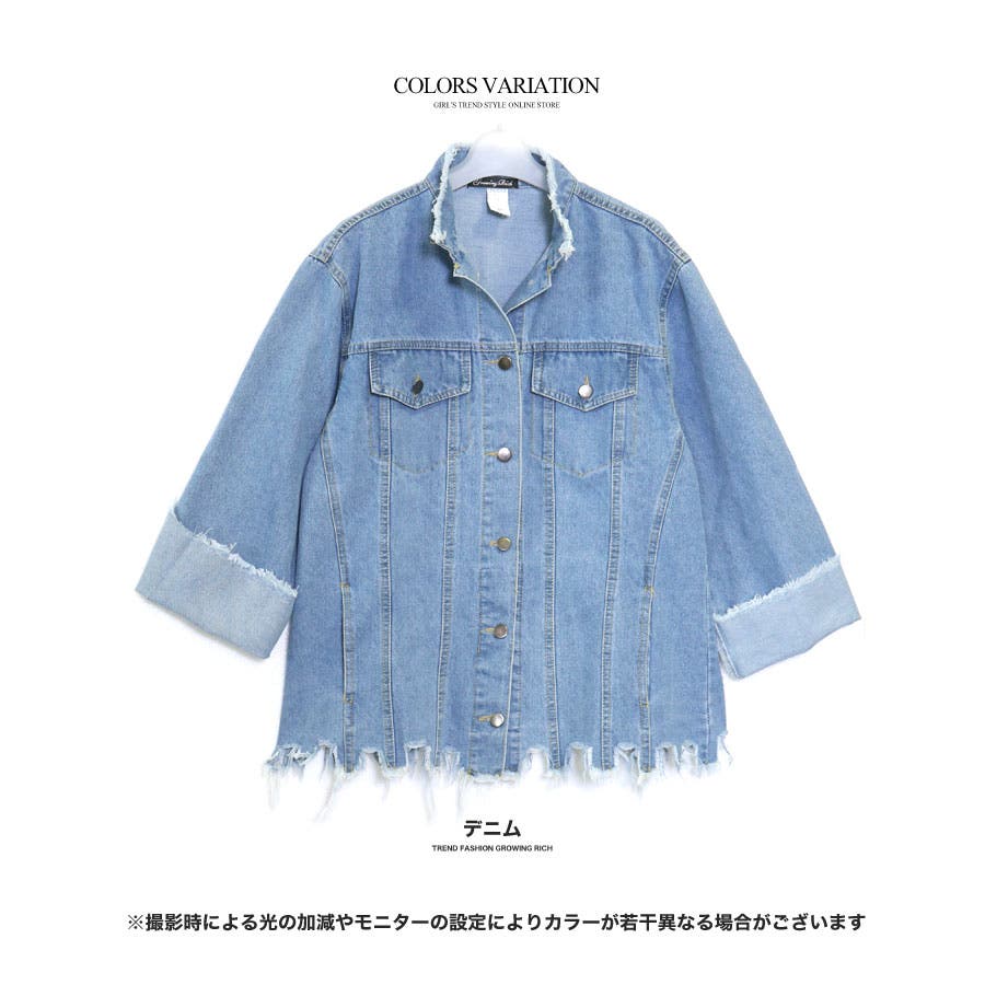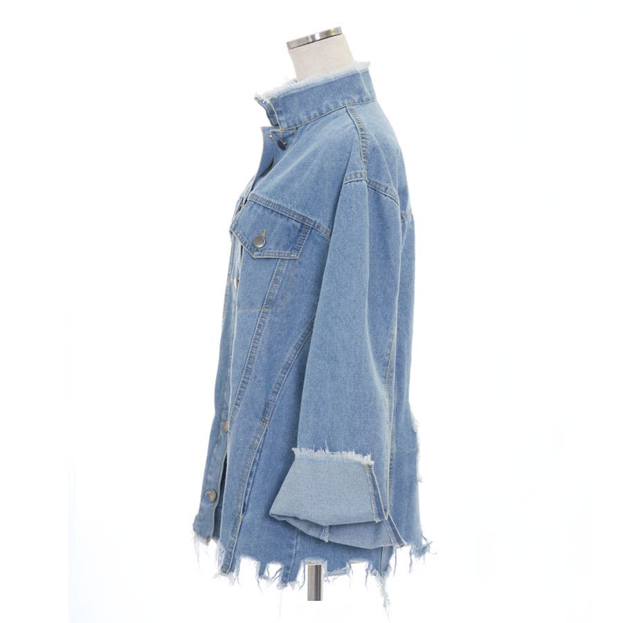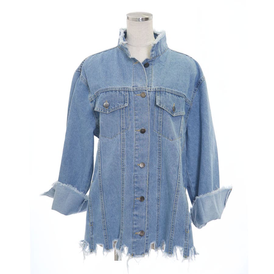インスタ映えするクールデザイン 裾ダメージフレアスリーブスタンドネックGジャン