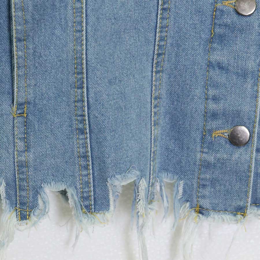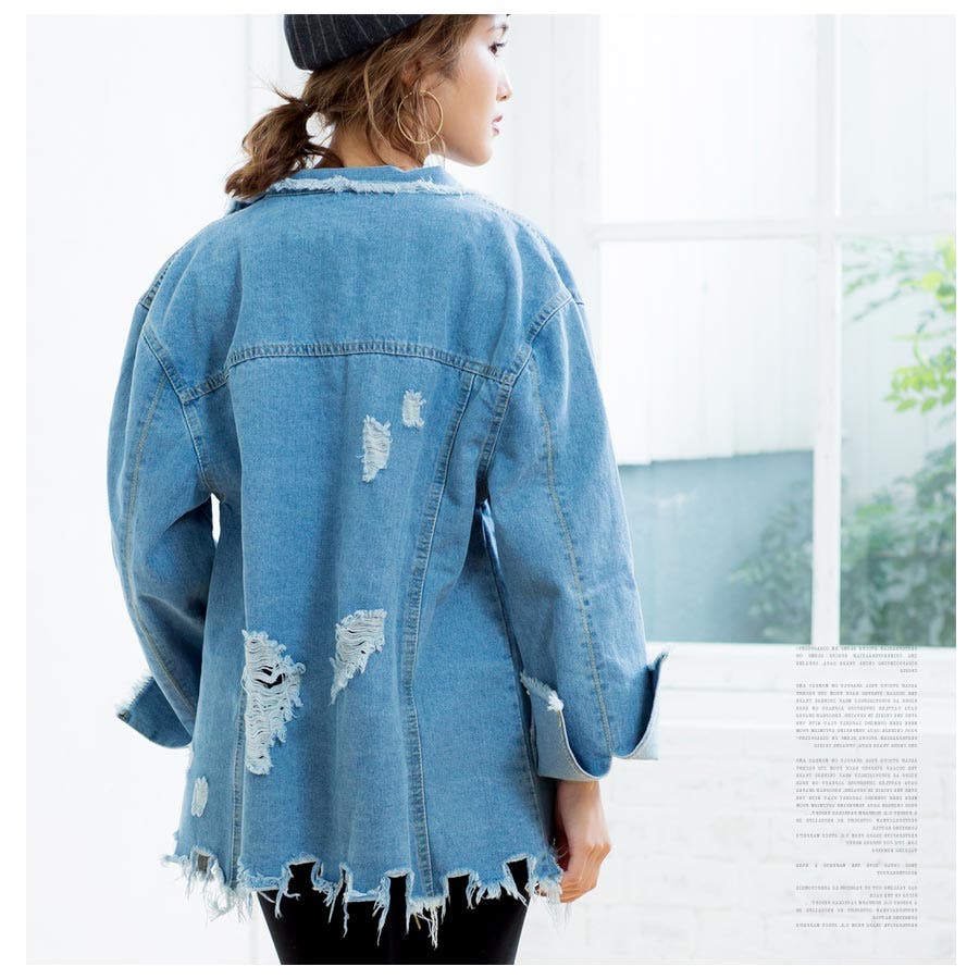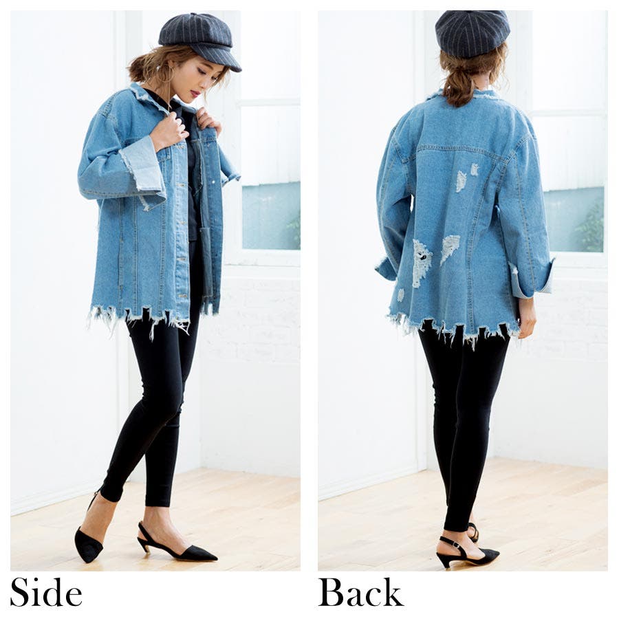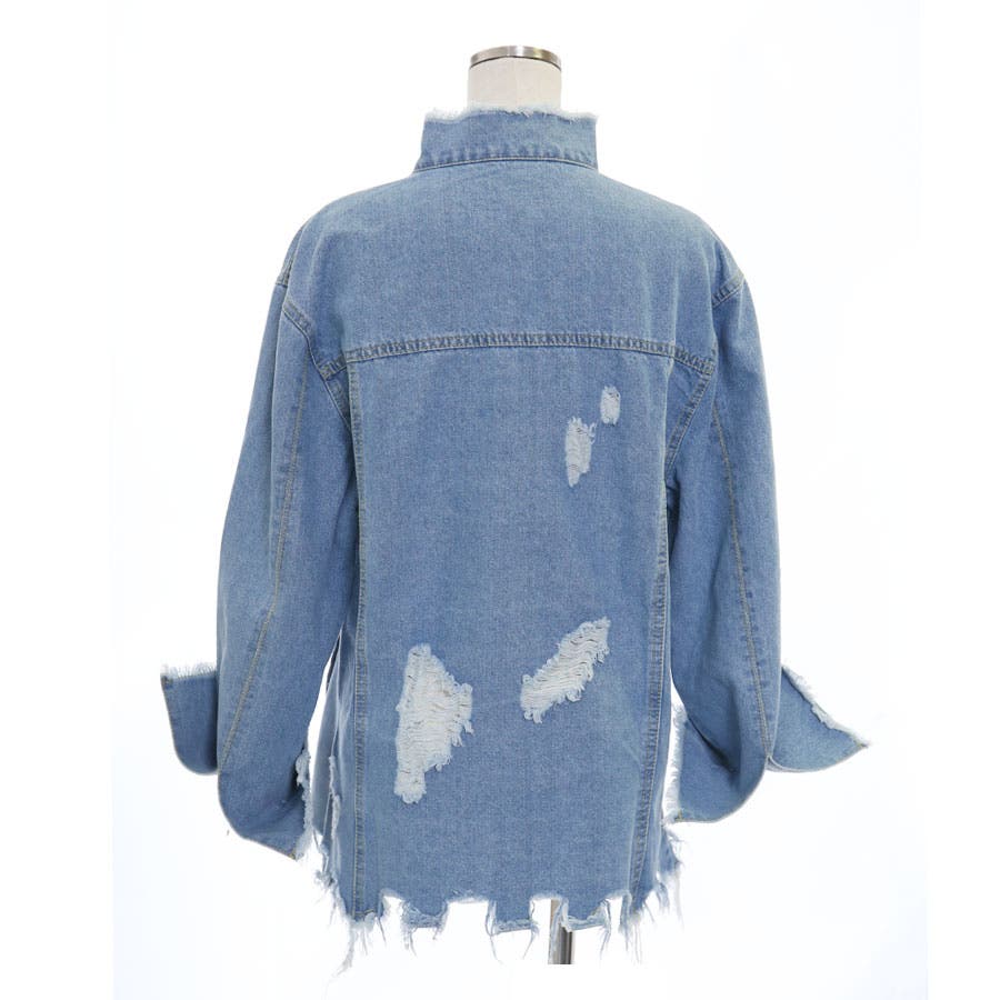 インスタ映えするクールデザイン 裾ダメージフレアスリーブスタンドネックGジャン