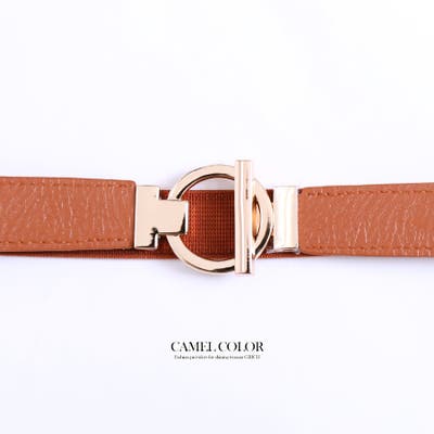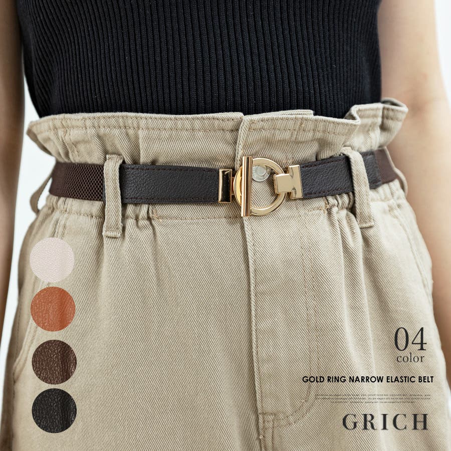 ゴールドのバックルがコーデを格上げするシンプルな細ベルト。ゴム仕様で程よくボディにフィット。シンプルコーデのワンポイントに最適。ウエストをマークすることで、いつものウエアーにメリハリをプラス。