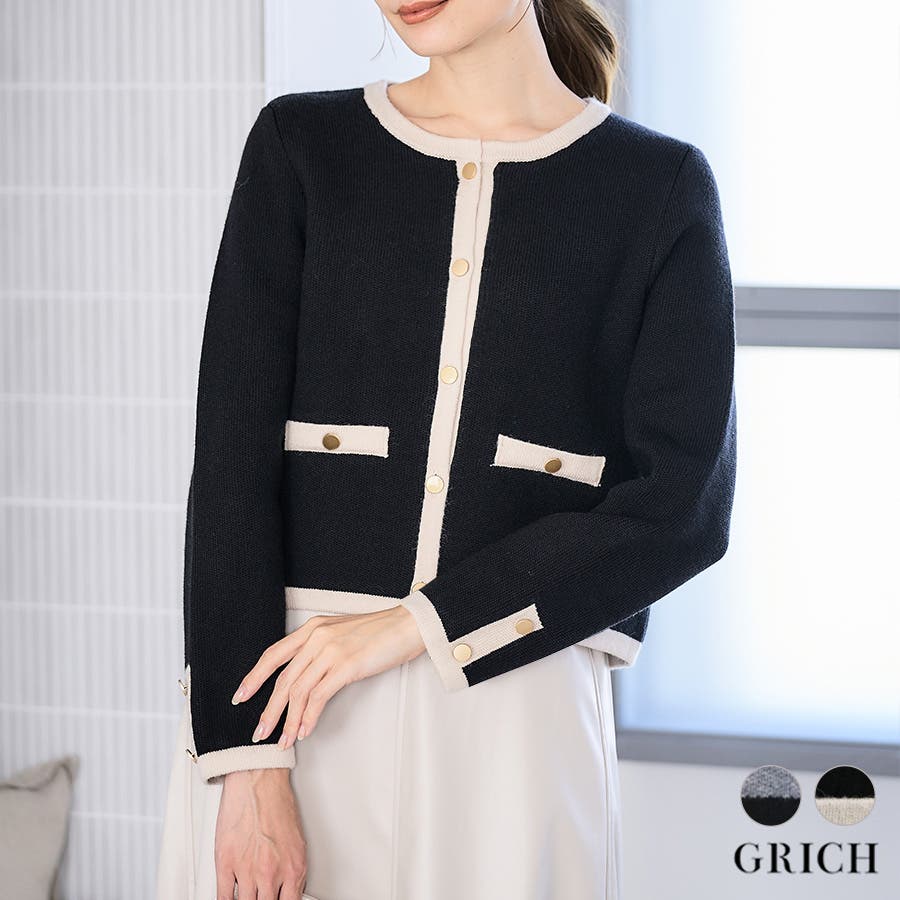 ノーカラー配色ニットジャケット 配色ニット ジャケット