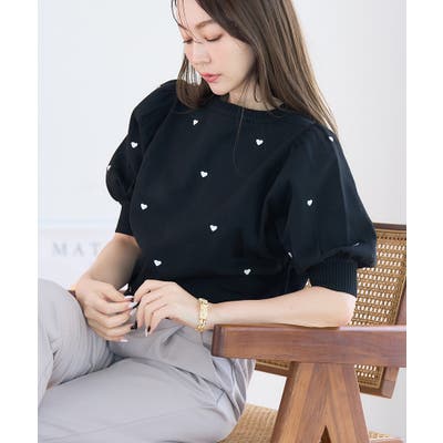 ハート刺繍 ボリューム袖ニットプルオーバー ハート刺繍