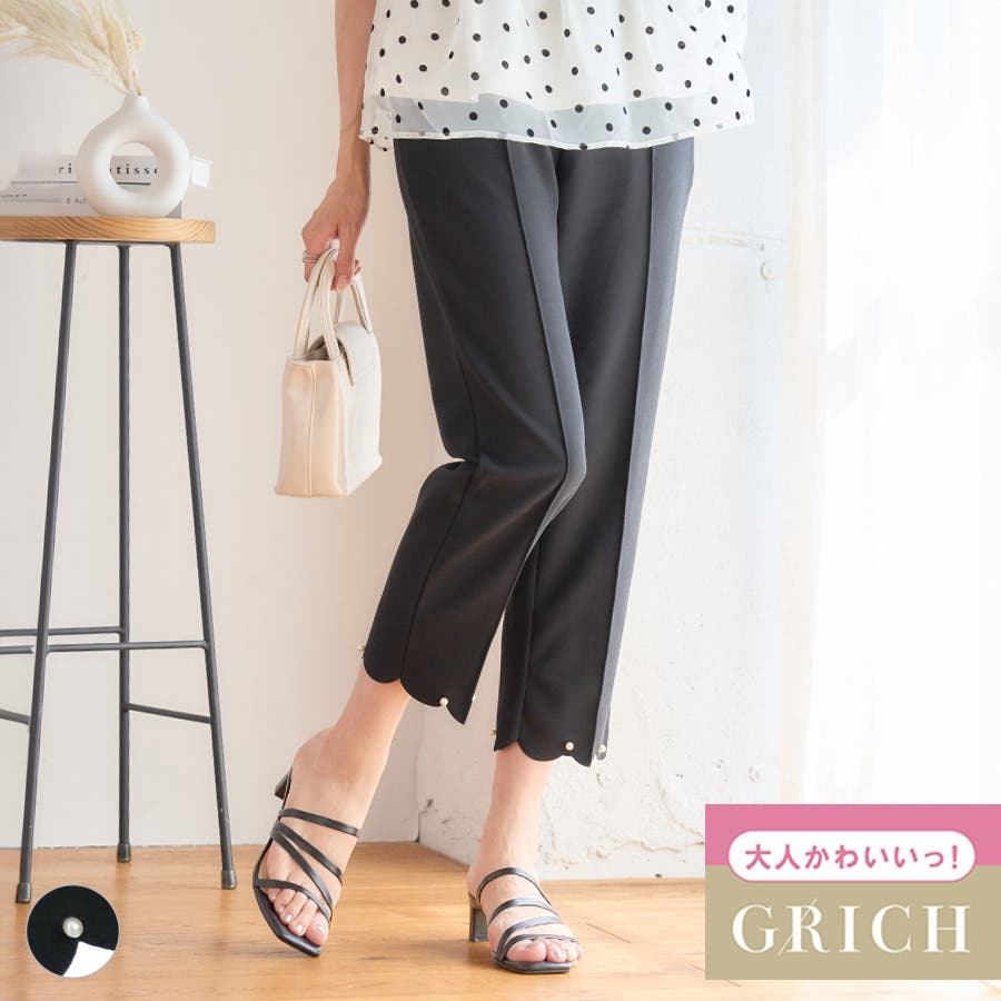 パール付き裾スカラップテーパードパンツ パール付き裾スカラップテーパードパンツ …