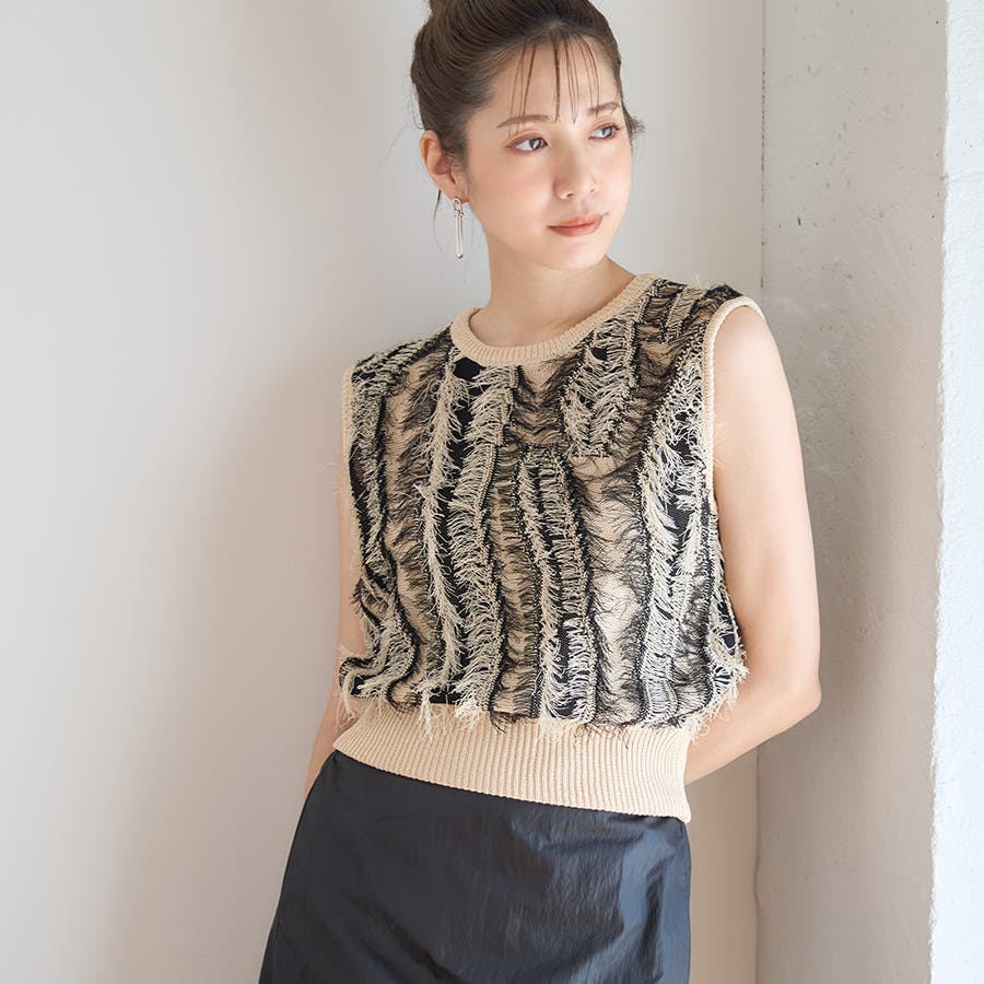 【G-RICH】涼しげ麻タッチで夏コーデを格上げ。フリンジニット ノースリーブトップス(春夏)