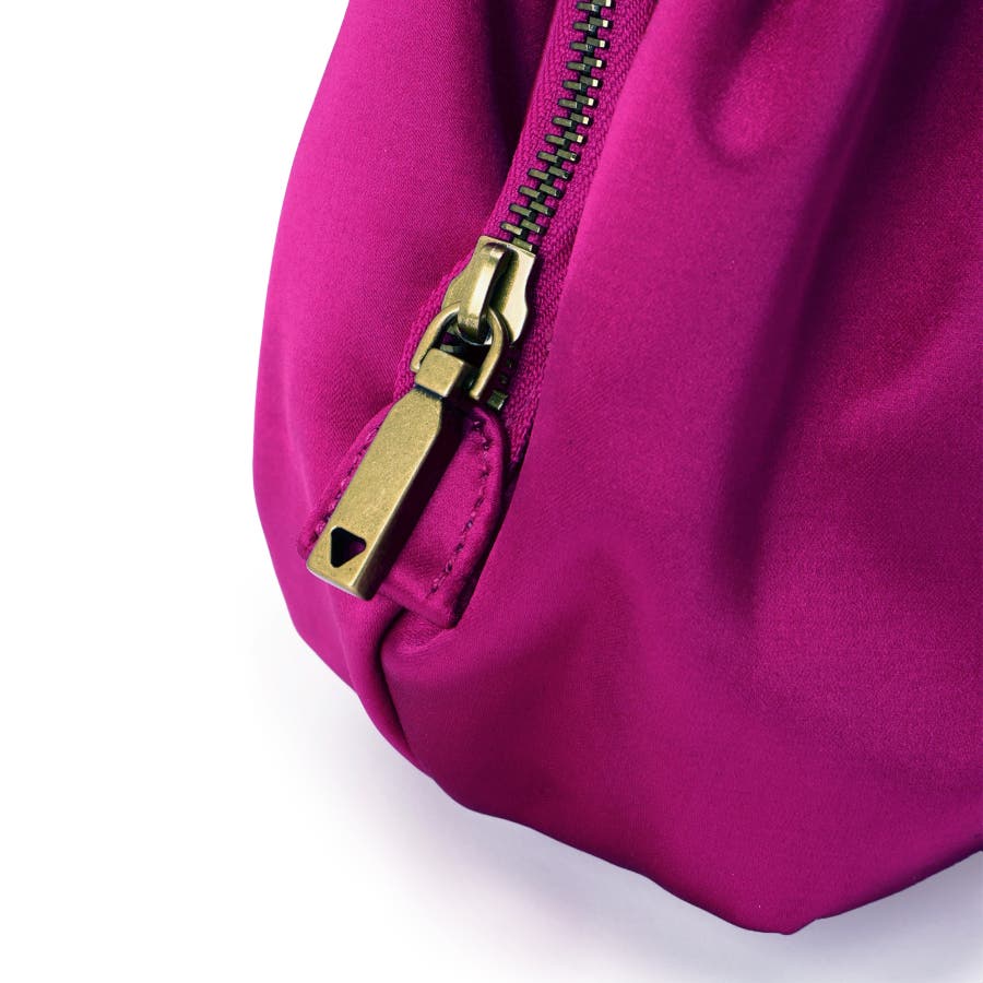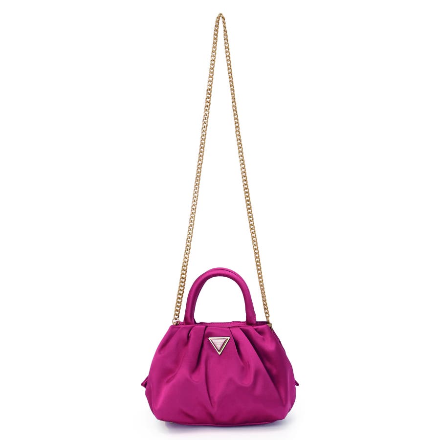 高級感のあるサテン素材を使用したサッチェルバッグ。タックの生み出すふっくらとした丸みのあるフォルムが女性らしい柔らかな印象を演出してくれます。フロントのトラアングルモチーフも上品なワンポイントをプラス。ショルダーチェーンは取り外しすることもでき、気分やコーデに合わせて2WAYのスタイリングを楽しむことができます。 内側オープンポケット:3 内側ファスナーポケット:1