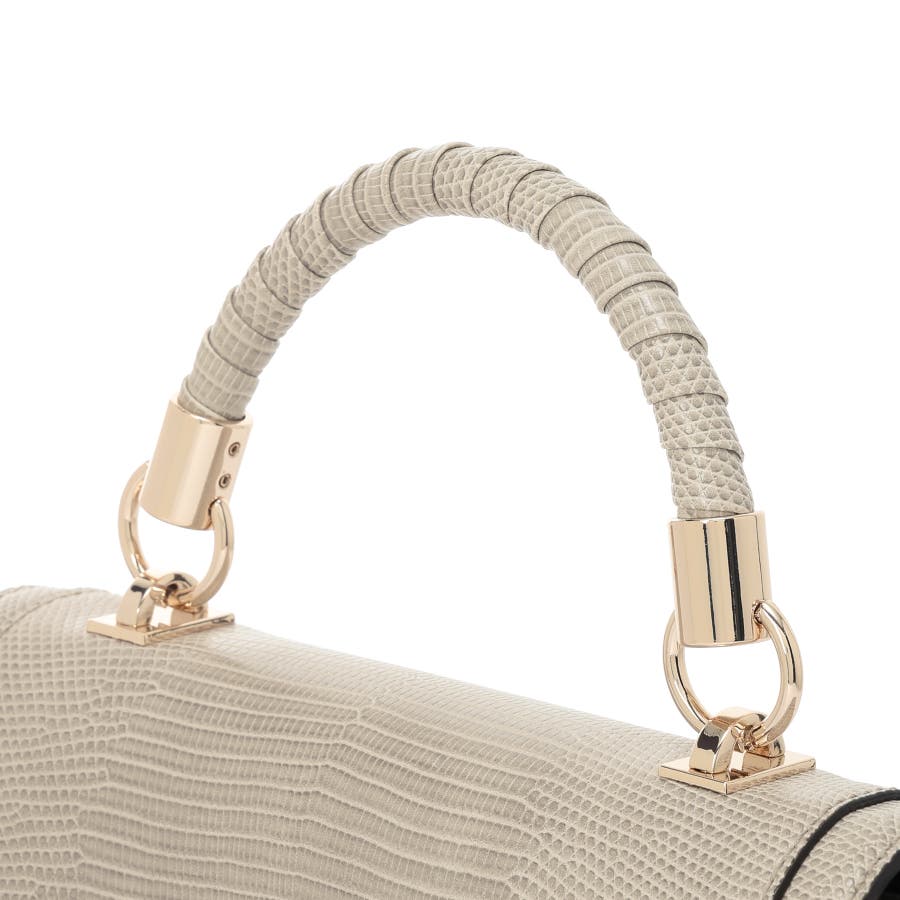 クロコ調の合皮にイニシャルモチーフがアクセントになったハンドルバッグ。