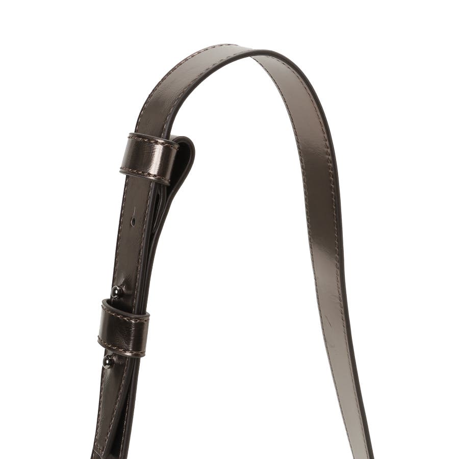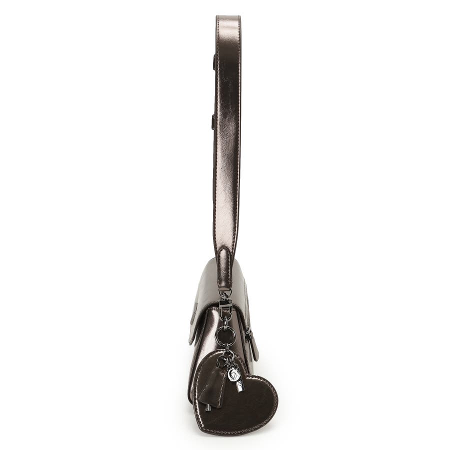 上品な光沢を放つ合成皮革に、大胆なハートチャームが華やかさをプラス。