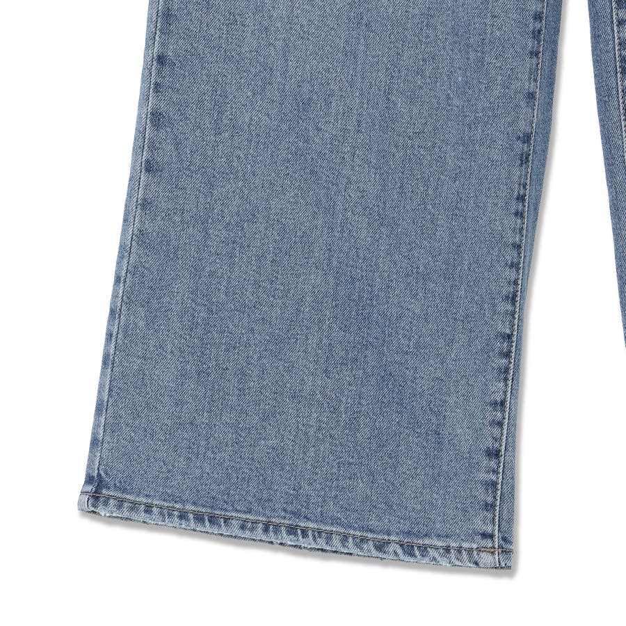 足長効果が期待できるワイドシルエットのデニムパンツ。ところどころに入ったクラッシュがよりヴィンテージ感を高めてくれます。足先にかけて太さが変わらないデザインで、どんなアイテムとも相性抜群。Tシャツやパーカーなどの定番アイテムと合わせても抜け感のあるコーデが完成します。腰からヒップにかけて深めに作られており、長い時間履いていてもストレスフリーに過ごせます。