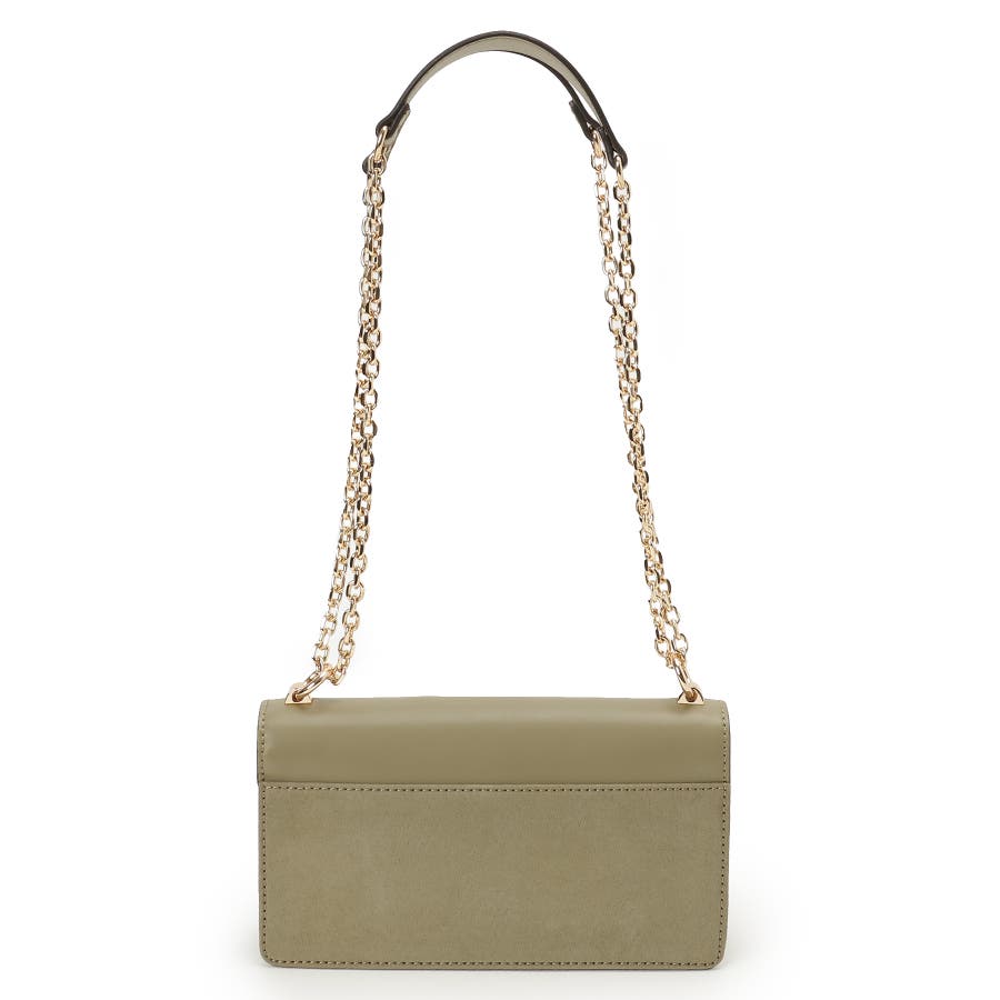 上品なカラーとゴールドチェーンの組み合わせが、洗練された大人の印象を演出するバッグ。