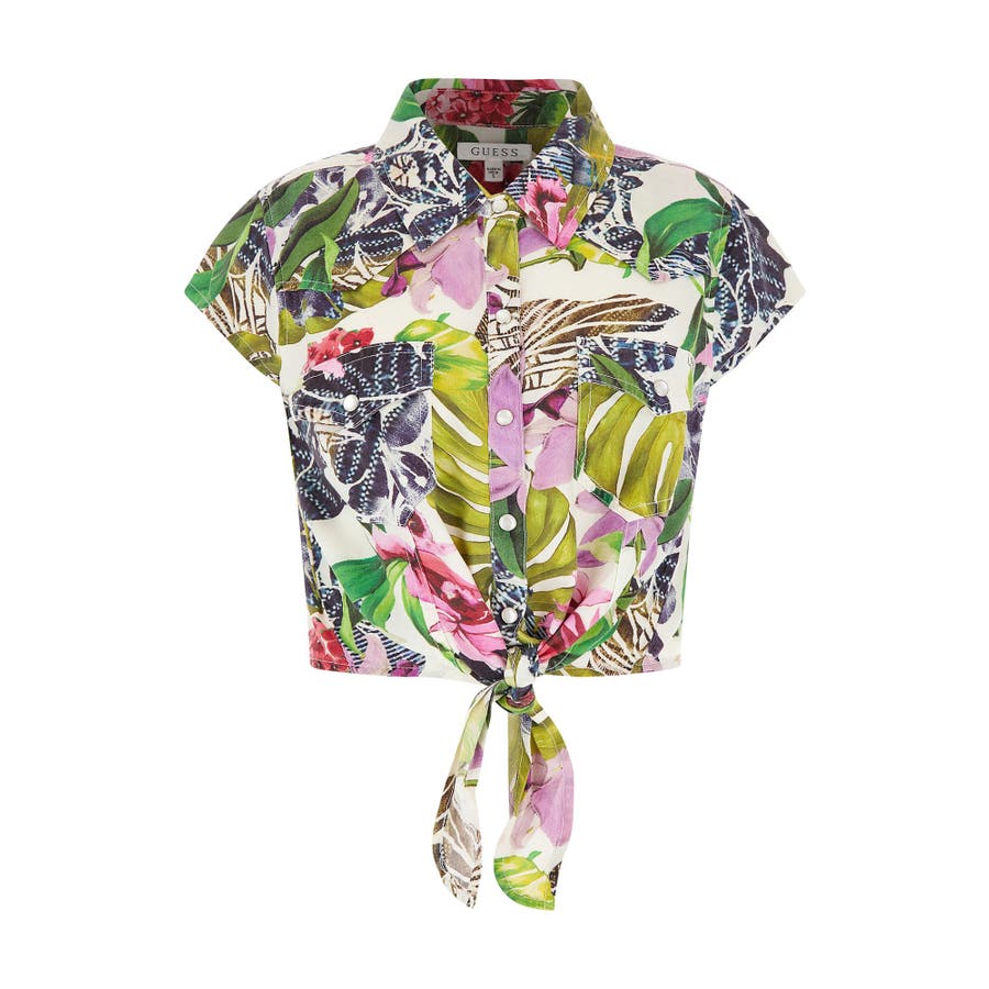 鮮やかなボタニカルプリントが存在感を放つシャツ。コンパクトなスリーブも爽やかな印象を演出。フロント裾はリボンになっており、愛らしくメリハリ感をプラスしてくれます。ヘルシーなショート丈でスタイルアップ効果も後押し。コーディネートを華やかに彩るアイテムです。