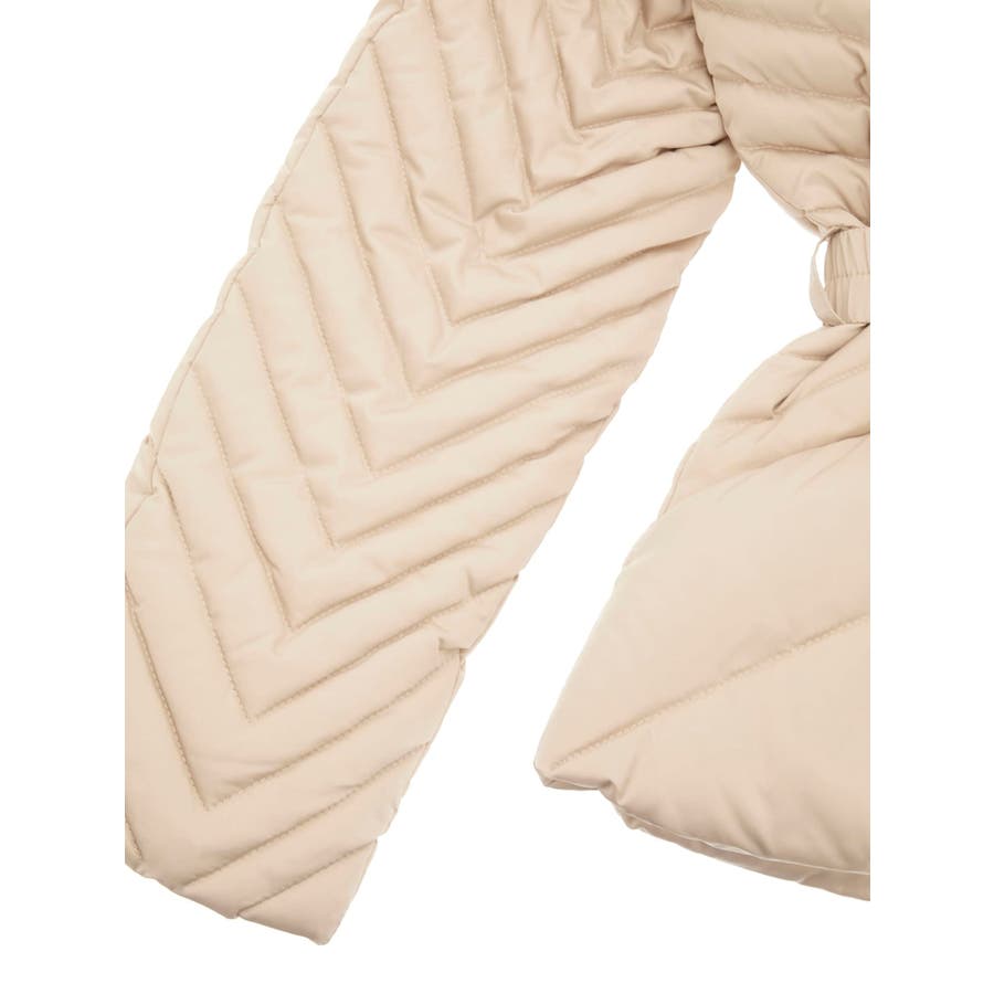 | 素材 | 表地:ポリエステル100% 裏地:ポリエステル100% 詰物:アイダー(ケワタガモ)・ダウン80%, 羽毛20% フード詰物:ポリエステル100% 襟詰物:ポリエステル100% 毛皮:アクリル繊維55%, モダクリル36%, ポリエステル9% ベルト:ポリエステル100% |