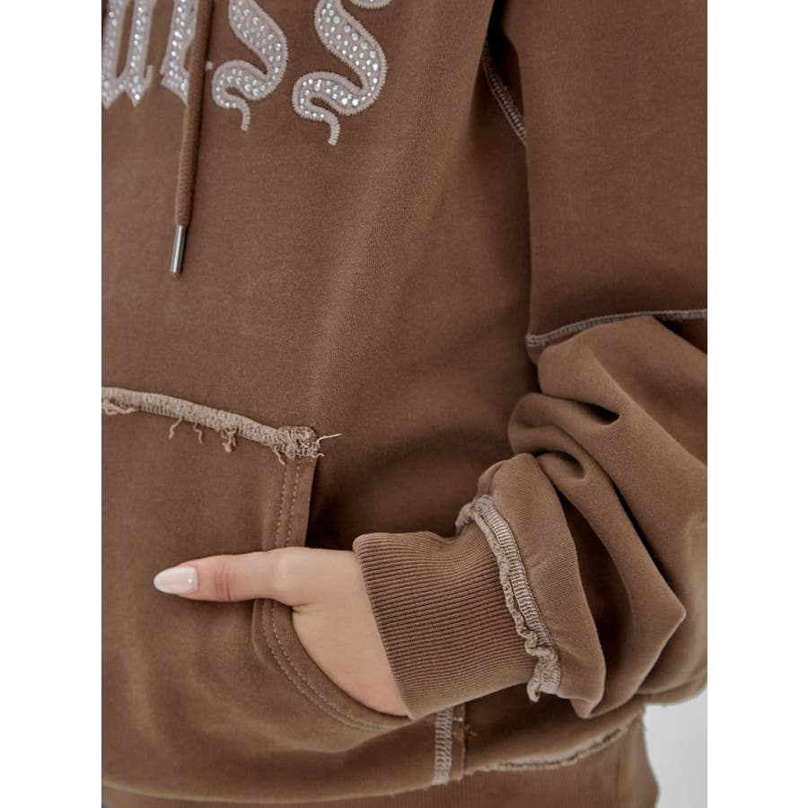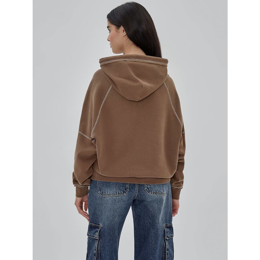 ユーズド風の切り替えと配色ステッチがアクセントになったフーディ。