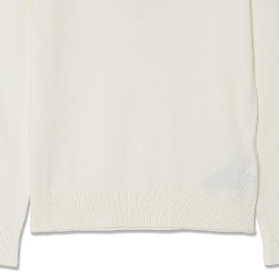 裾と袖口にはリブ編みを採用し、全体をすっきりとまとめています。