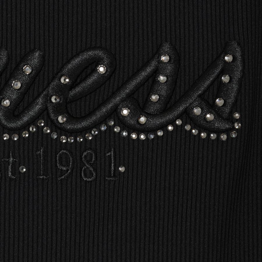 フロントには光沢感のあるラインストーンで縁取られたロゴ刺繍を配置し、シンプルな中に華やかさをプラス。