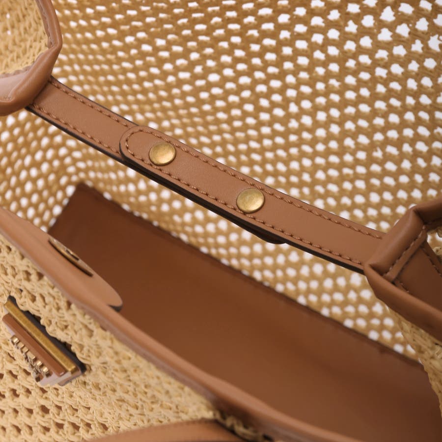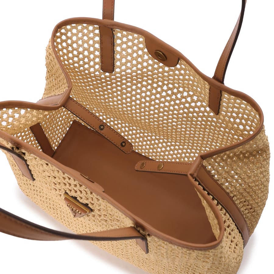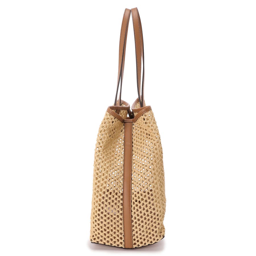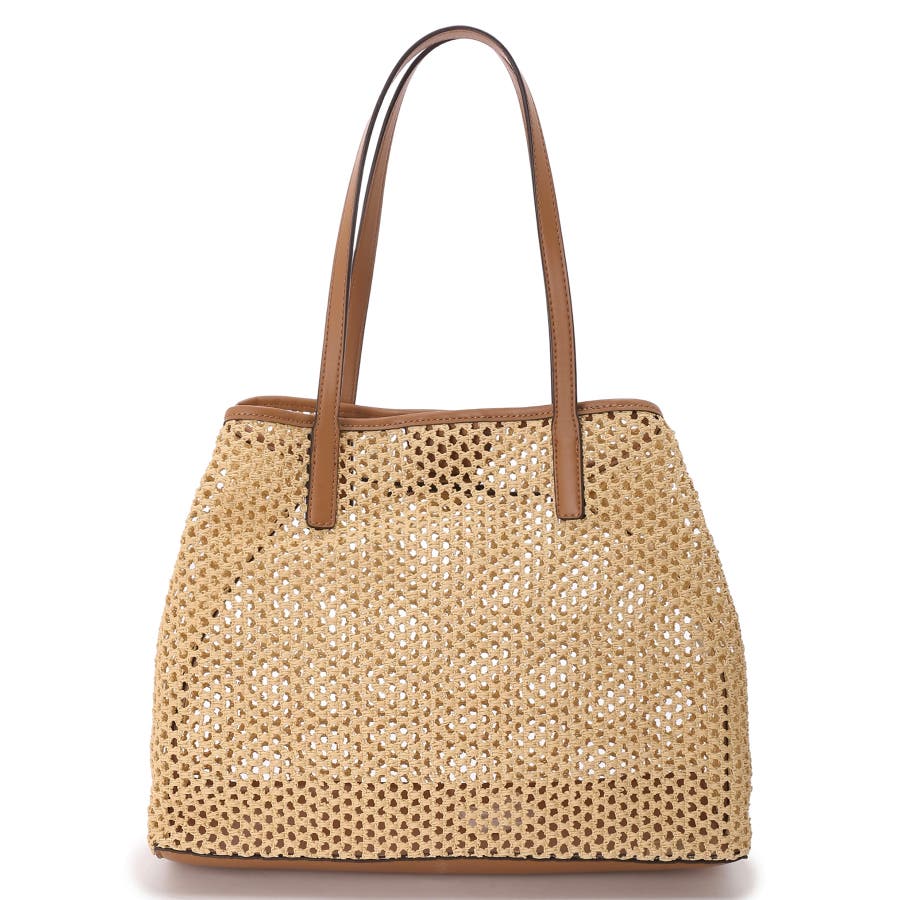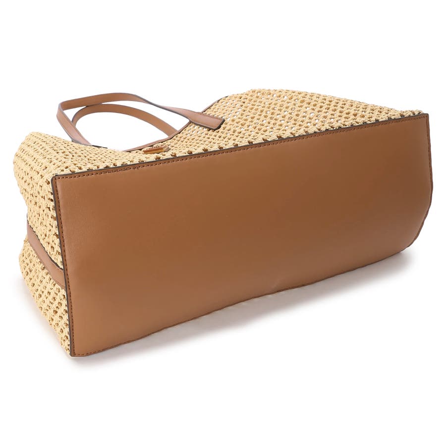 軽やかなペーパー素材とフェイクレザーのコンビで、モダンなデザインに仕上げたトートバッグ。インバッグとしても使えるミニバッグがセットになっています。幅広のマチと大きめサイズでたっぷり収納できるのも魅力ポイント。カジュアルなスタイルから、綺麗めコーデにと様々なスタイリングにもマッチしてくれます。[ポーチ] 高さ20cm 幅28cm マチ6cm 持ち手45cm A4サイズ収納可能