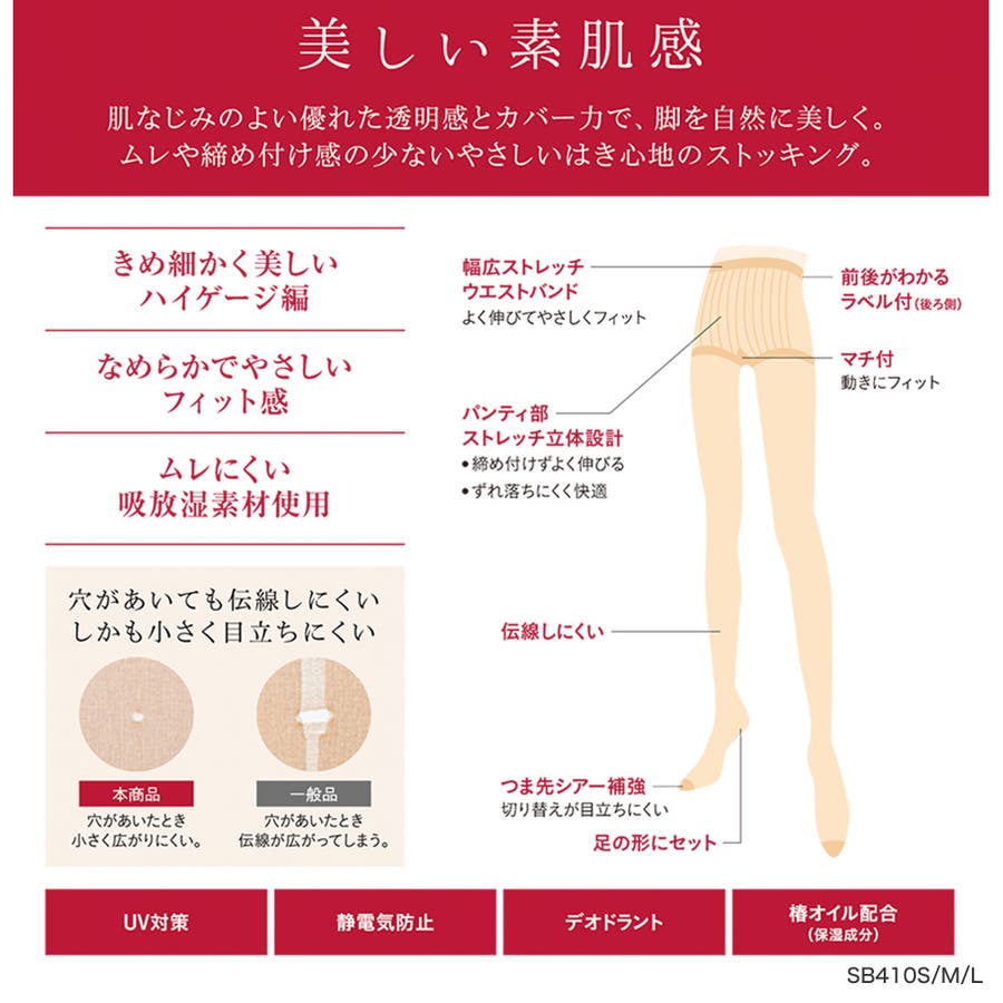 穴があいても伝線しにくい・きめ細かく美しいハイゲージ編 ・なめらかでやさしいフィット感 ・ムレにくい吸放湿素材使用 ・幅広ストレッチウエストバンドがよく伸びてやさしくフィット ・前後がわかるラベル付(後ろ側) ・パンティ部ストレッチ立体設計(締め付けずよく伸びてずれ落ちにくく快適)