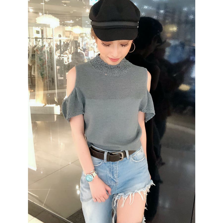 タートルですがクロシェニットでオフショルダーになっている珍しいトップスです。生地は綿でさらりとしているので春夏でも着用しやすいです。デニムとの相性のいいカラー展開になっています。