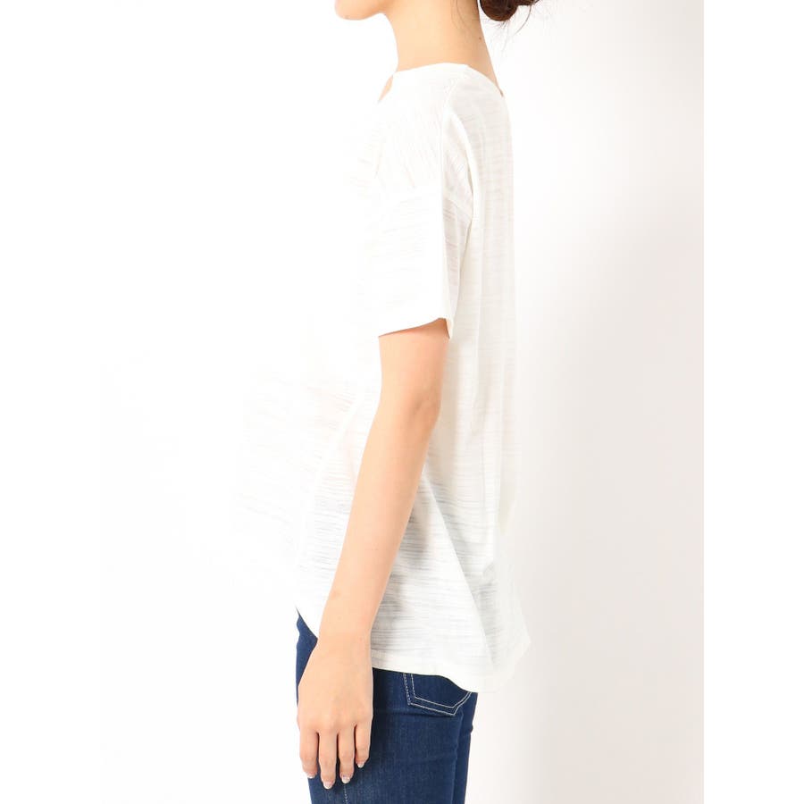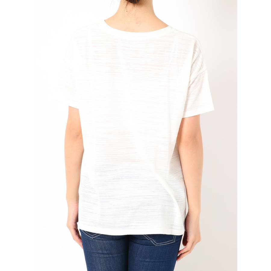 Vネック部分にデザインのはいったベーシックなT/Sです。スラブ地を使用しているのでデニムなどでさらっとかっこよくスタイリングできるアイテムです。