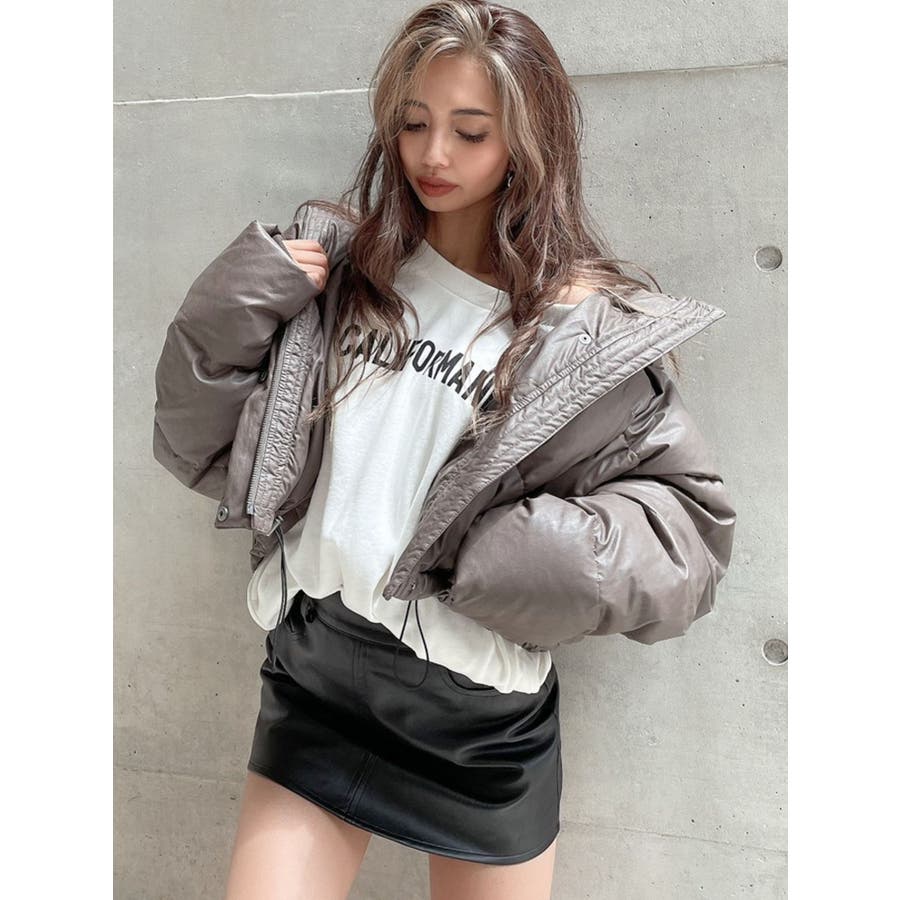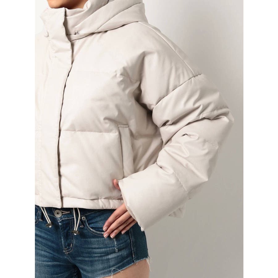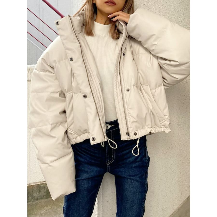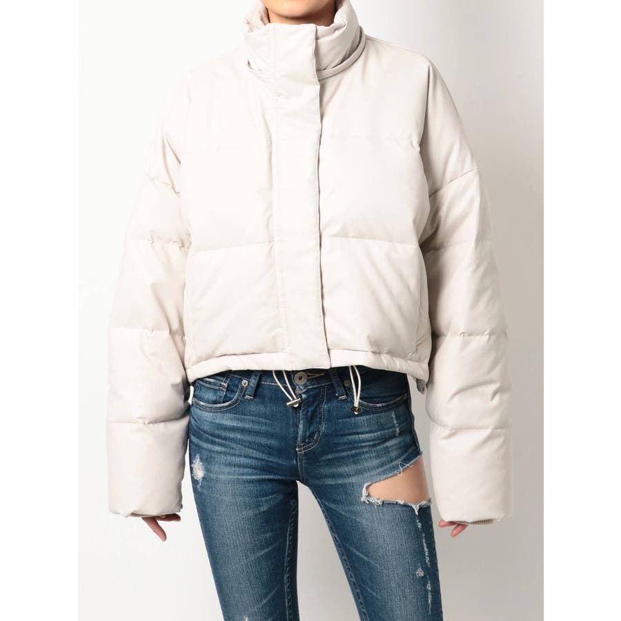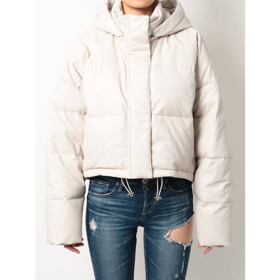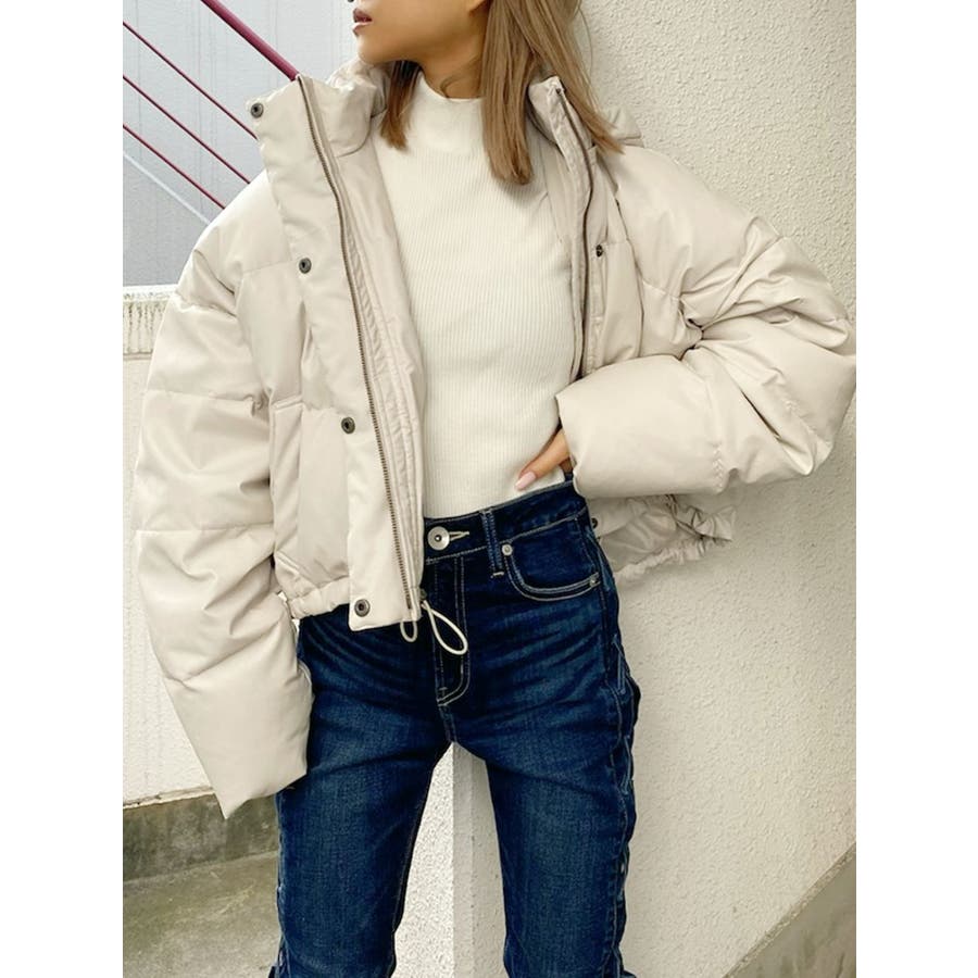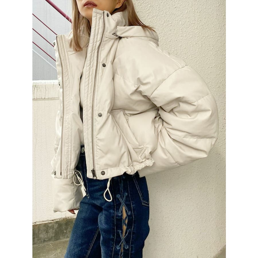 フェイクレザーの白ダウンが珍しくて即決しました。オフホワイトよりなのでどんな方にも合いそうです。丈もショートで裾が絞れるためスタイルアップします。ただ色的に黒い擦れ汚れなどは着きやすそう。(フェイクなので汚れても拭けば取れそうですが◎