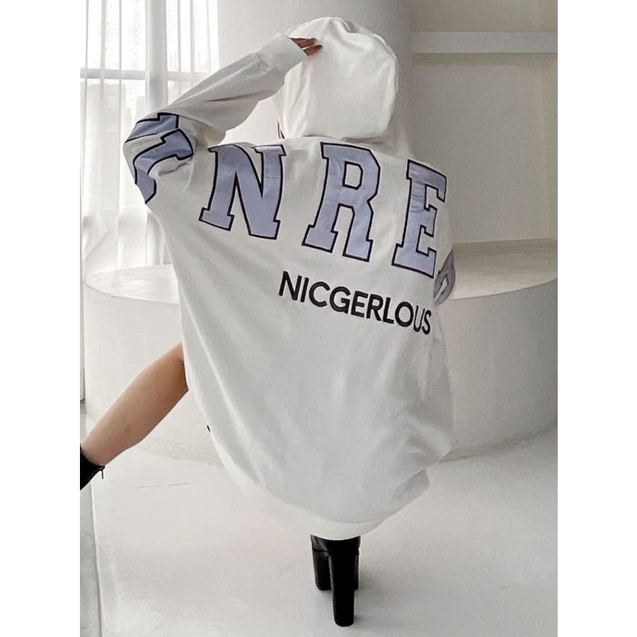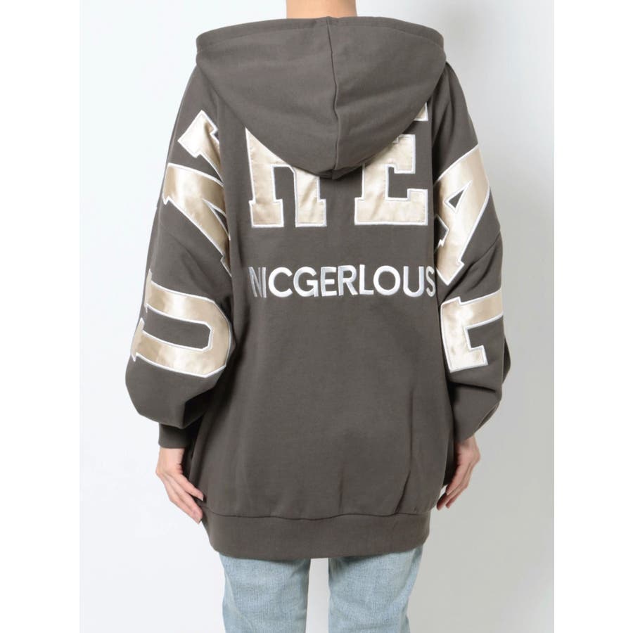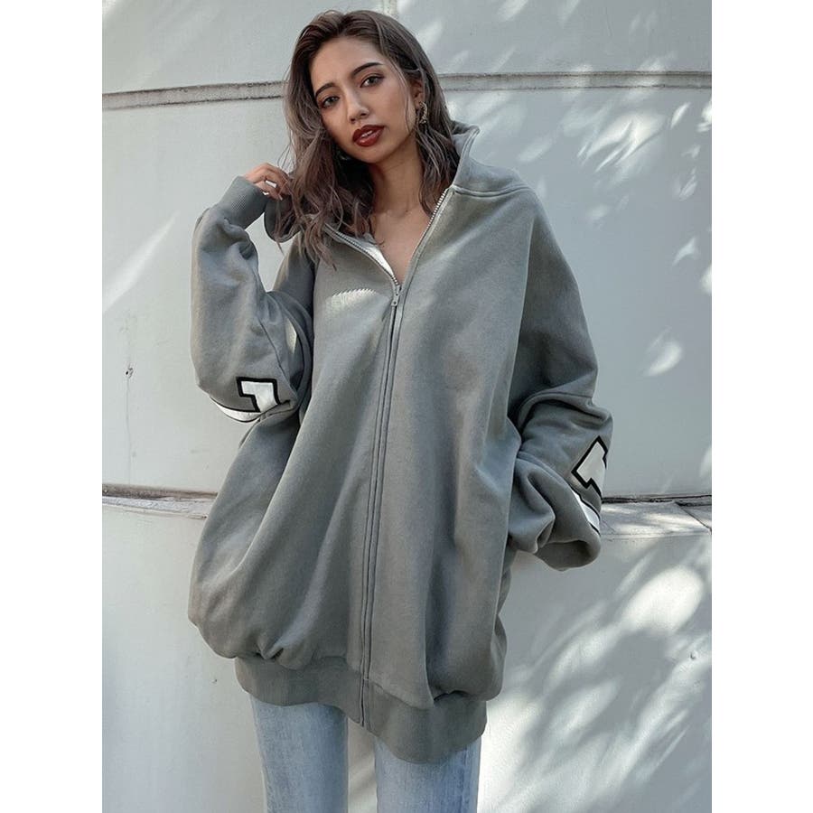 BACKスタイルに大胆に入ったサテン刺繍と刺繍ロゴが高級感があり、低身長の方はZIPを閉めていただきミニボトムと合わせていただくことで、ワンピース風にご着用いただくことも出来ます。