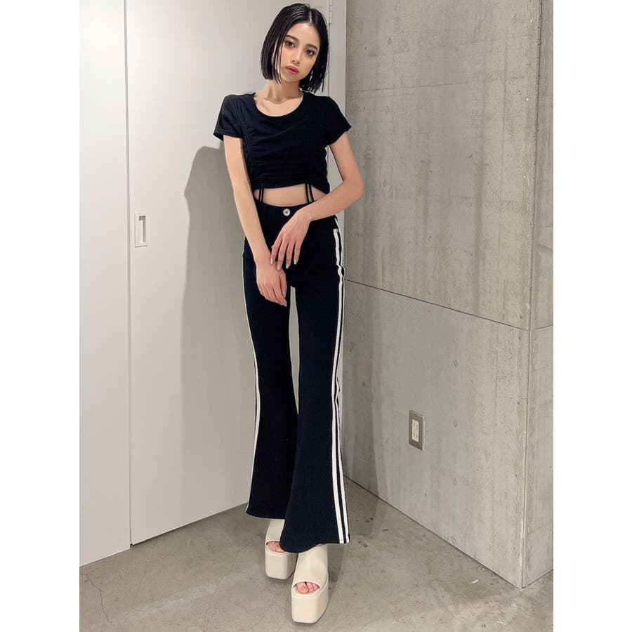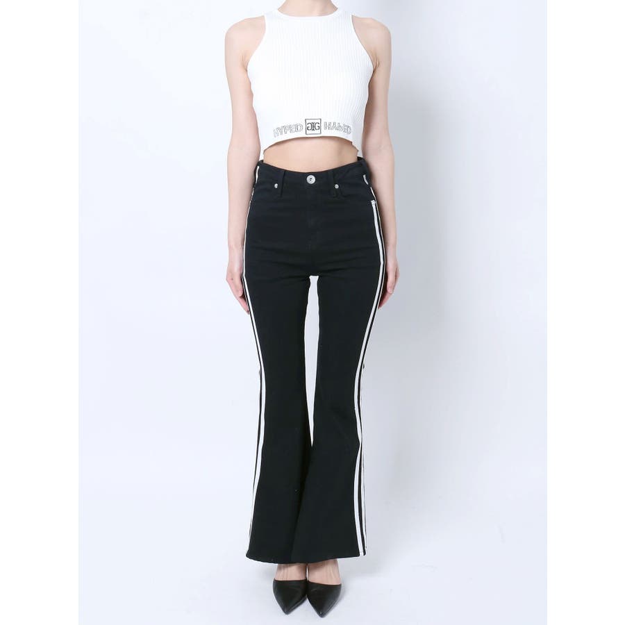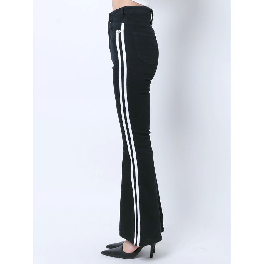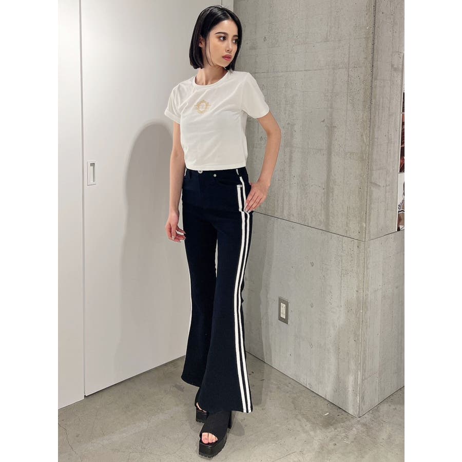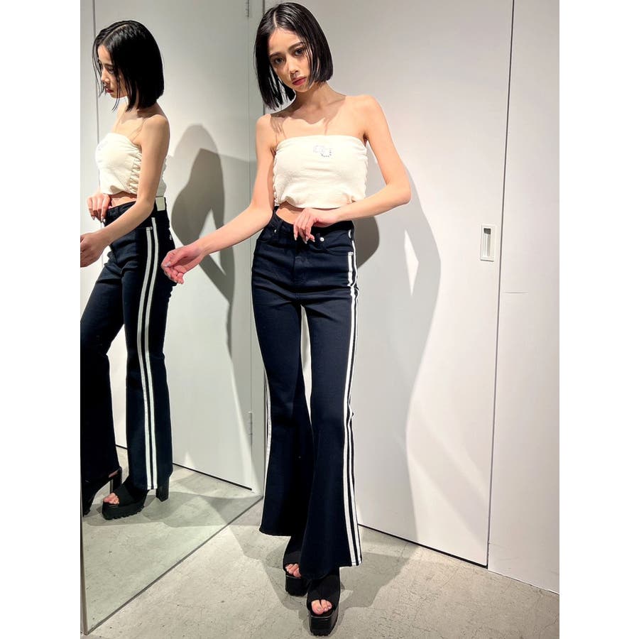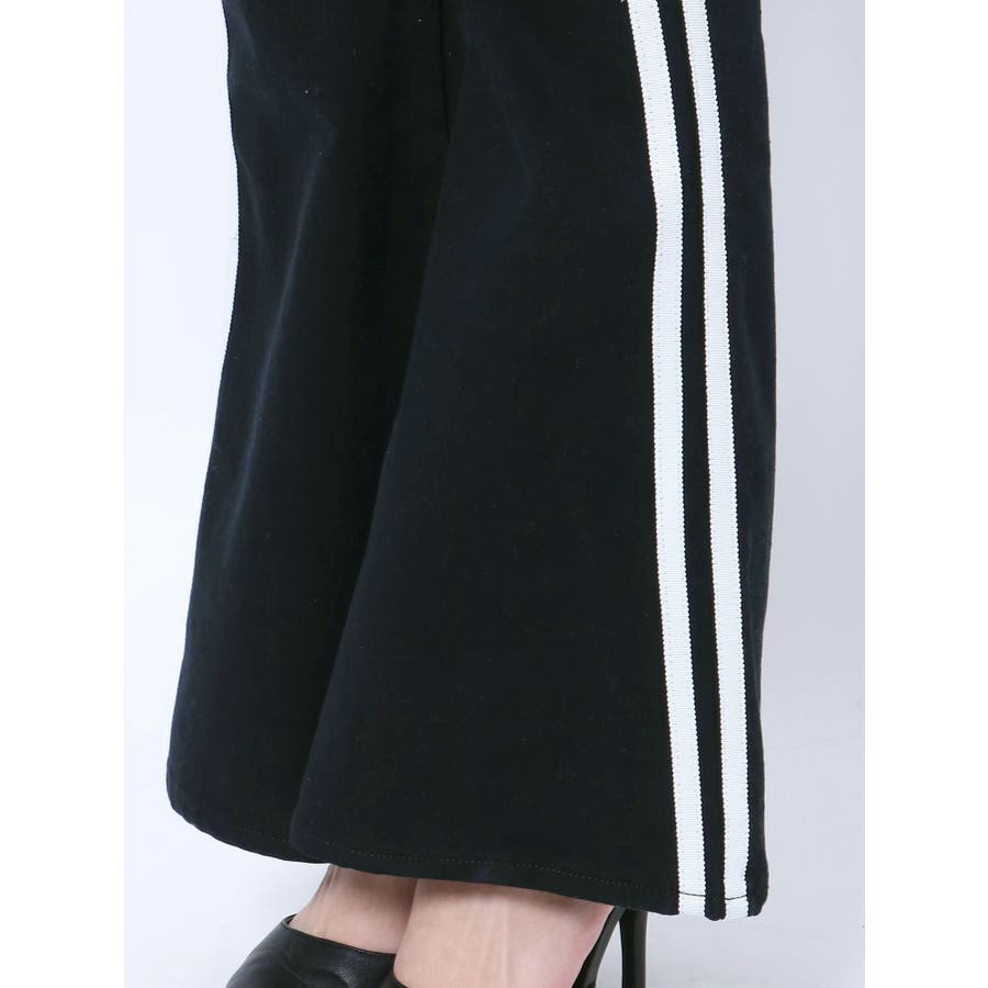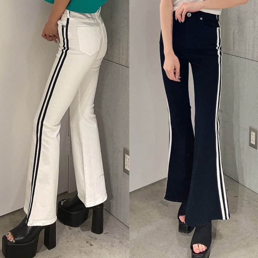 サイドにグログランテープの2本デザインを施したスポーティーのフレアパンツです。