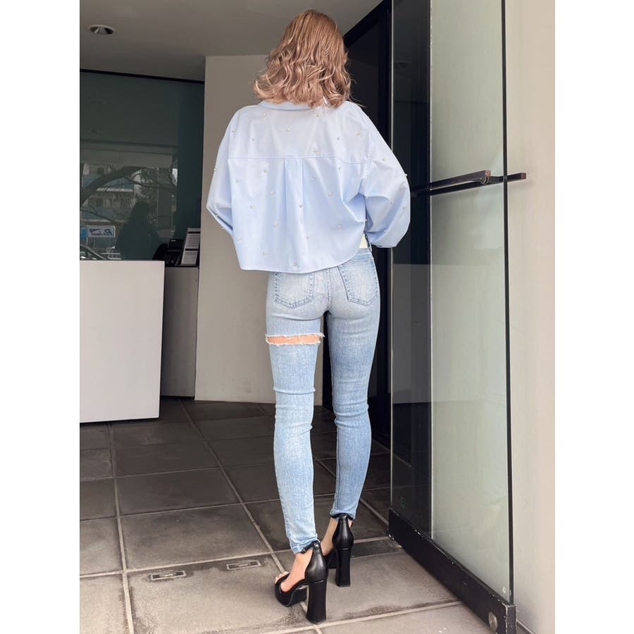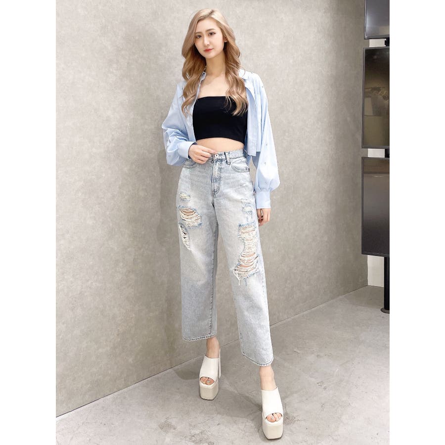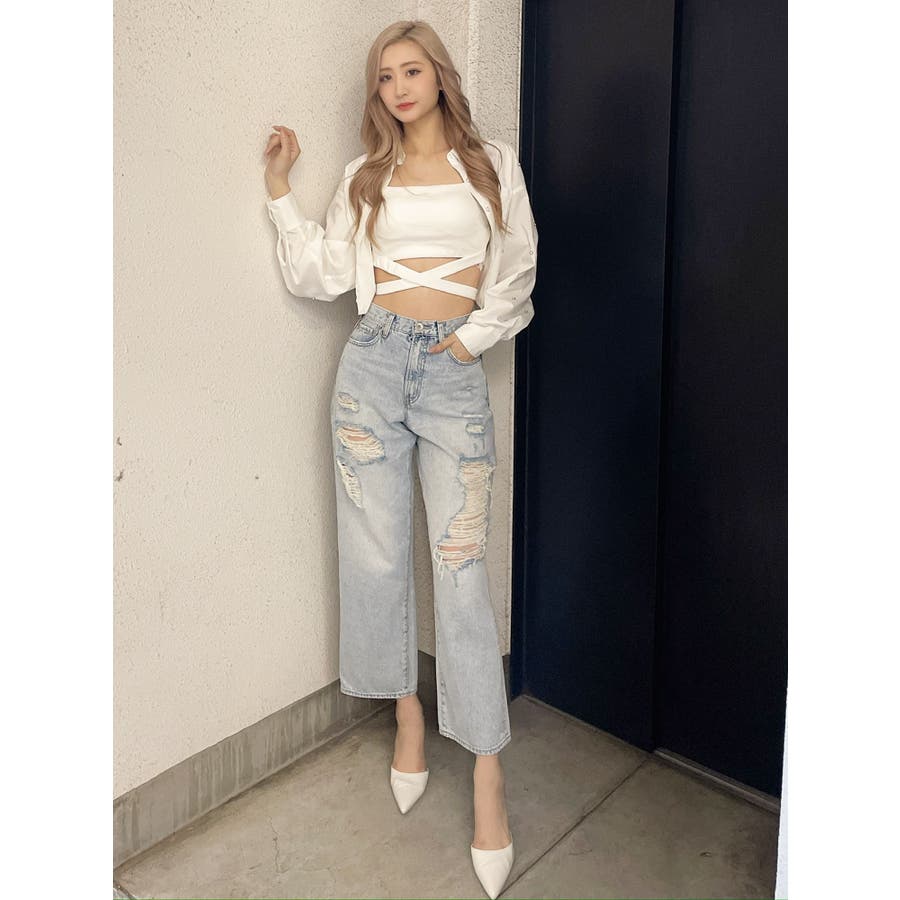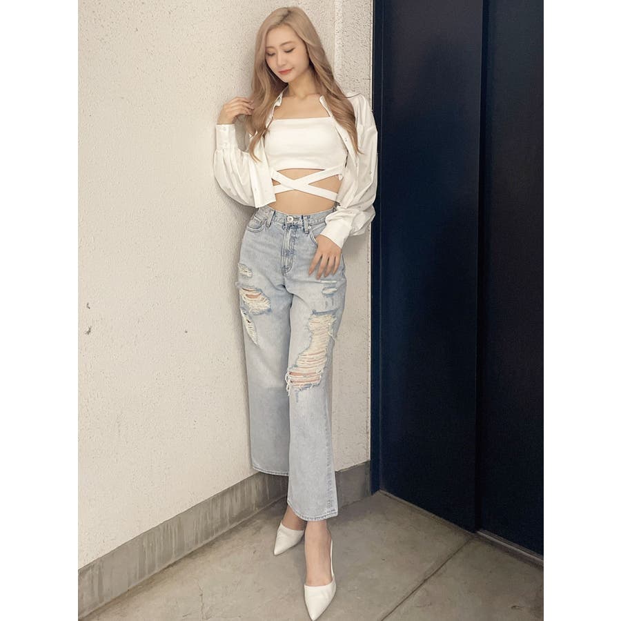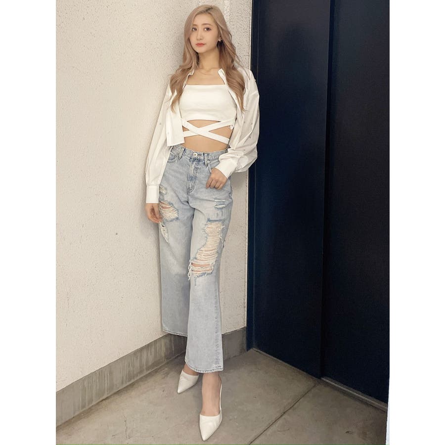 ボトムスはダメージデニムを合わせてカジュアルダウンした外しコーデがオシャレでオススメです。