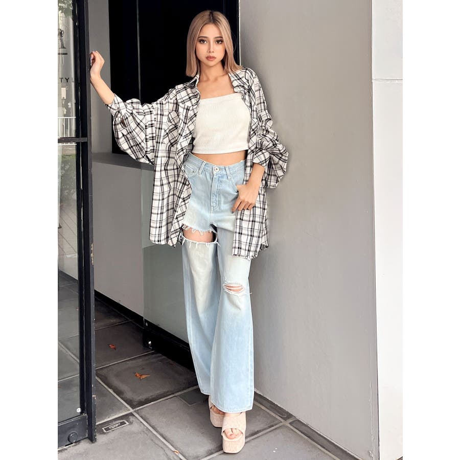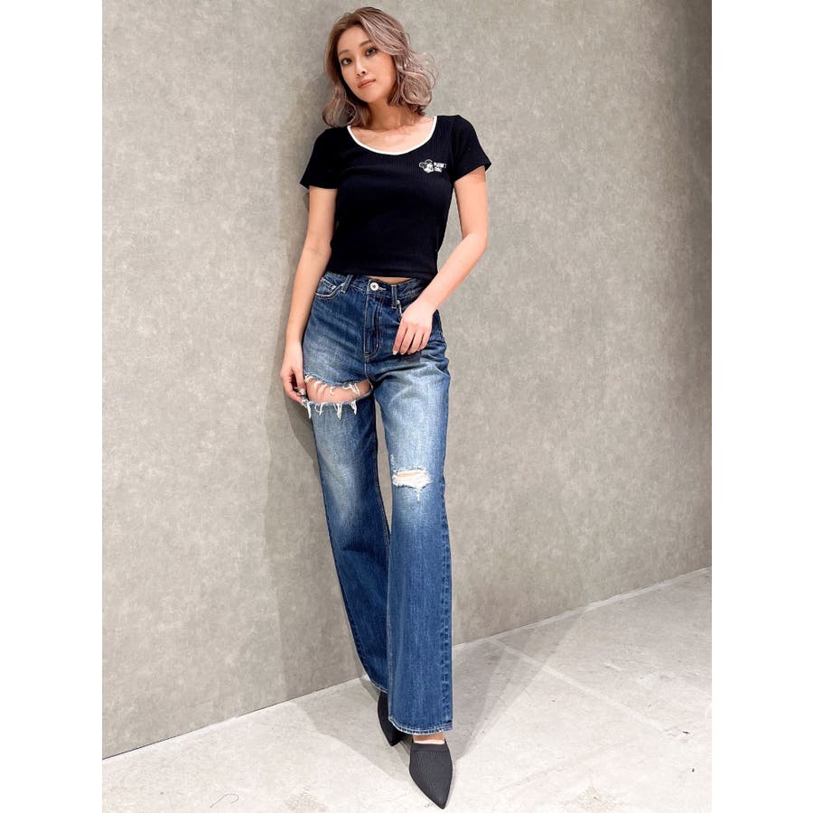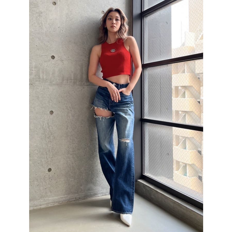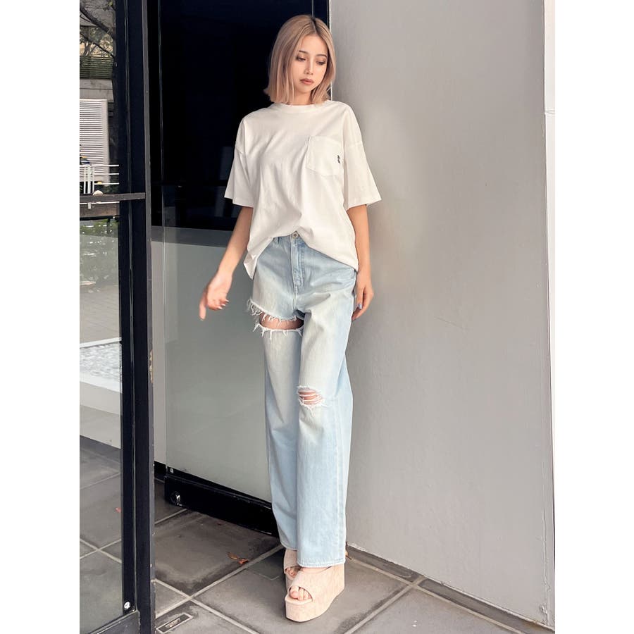 ペグトップパンツの時に比べ、より最旬デニムのシルエットに。