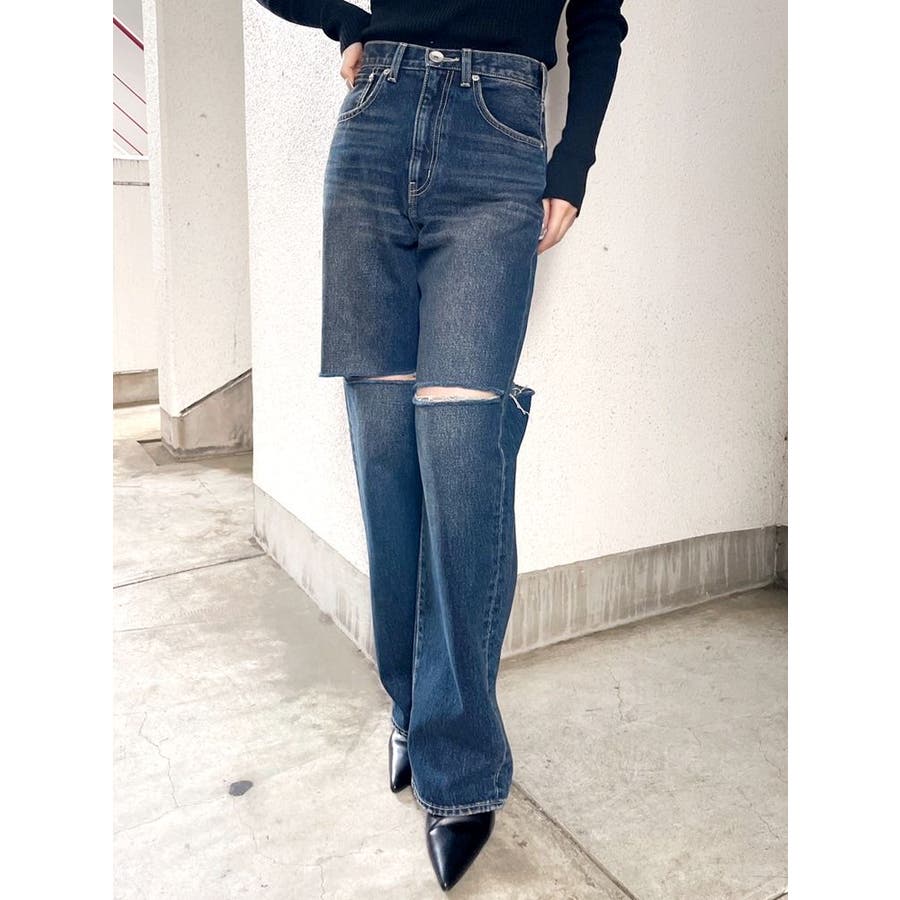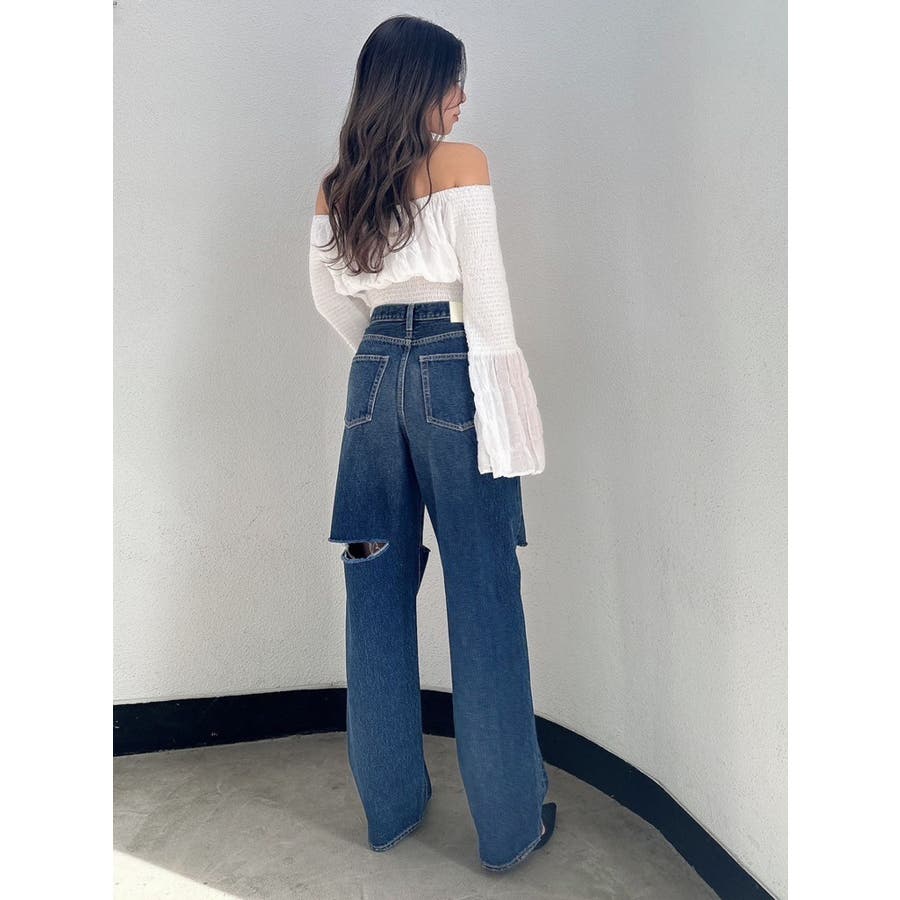ハイウエストfront and backダメージワイドデニムパンツ
